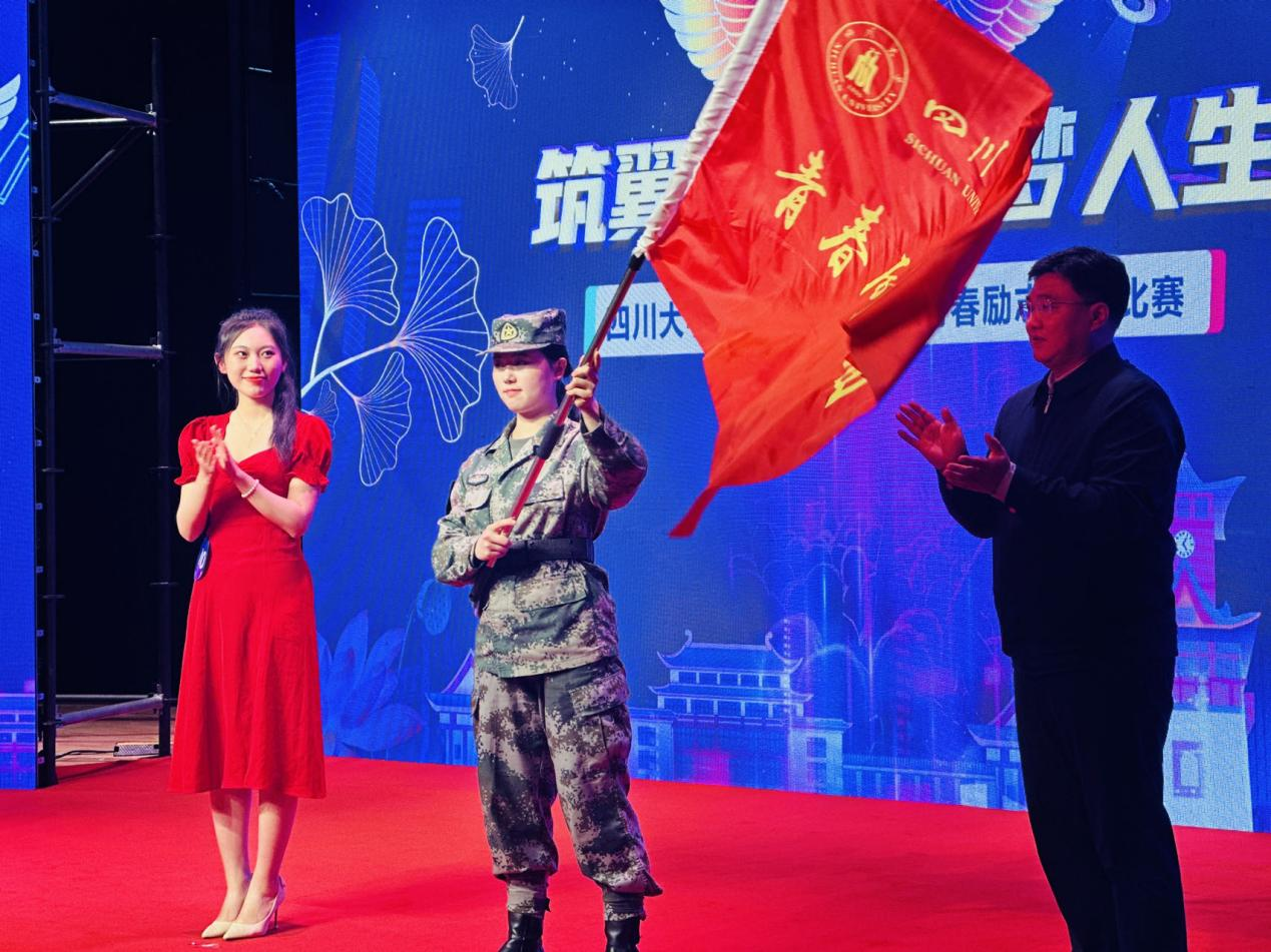 经过激烈的角逐,吴玉章学院2021级卢飞扬同学荣获特等奖,华西公共卫生学院2021级王萍同学荣获一等奖,其余同学分别获得二等奖、三等奖和优胜奖。伴随一曲《万爱千恩》,应邀而来的选手家长在掌声中登上舞台,为获奖选手颁发证书和奖品,同学们也用鲜花和拥抱感谢家人的陪伴。学工部部长刘晓虎为新一届励志宣讲团进行了授旗。