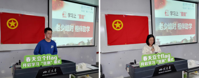 一年之计在于春,在春天,撒下一粒种子,便种下一份收获的希望。在新学期,立个flag,定下小目标,不断做出改变,在这个春天乘势而上,开启学习“狂飙”模式!活动伊始,主持人李珍珍向与会人员强调了本次“跟班关爱”活动的内容及流程,指出要把学习贯彻二十大精神和2023年两会精神作为当前和今后一个时期的首要任务,同时激发自身刻苦学习的动力,努力钻研,开拓创新。本次活动包括两部分内容,第一部分是聚焦两会,邀请老教师和学生代表学习全国两会精神,凝聚团结奋进力量,为学生在思想上“充电”;第二部分是聚焦学业,一对一结对帮扶,助力学生成长成才,为学生在学习上“蓄能”!