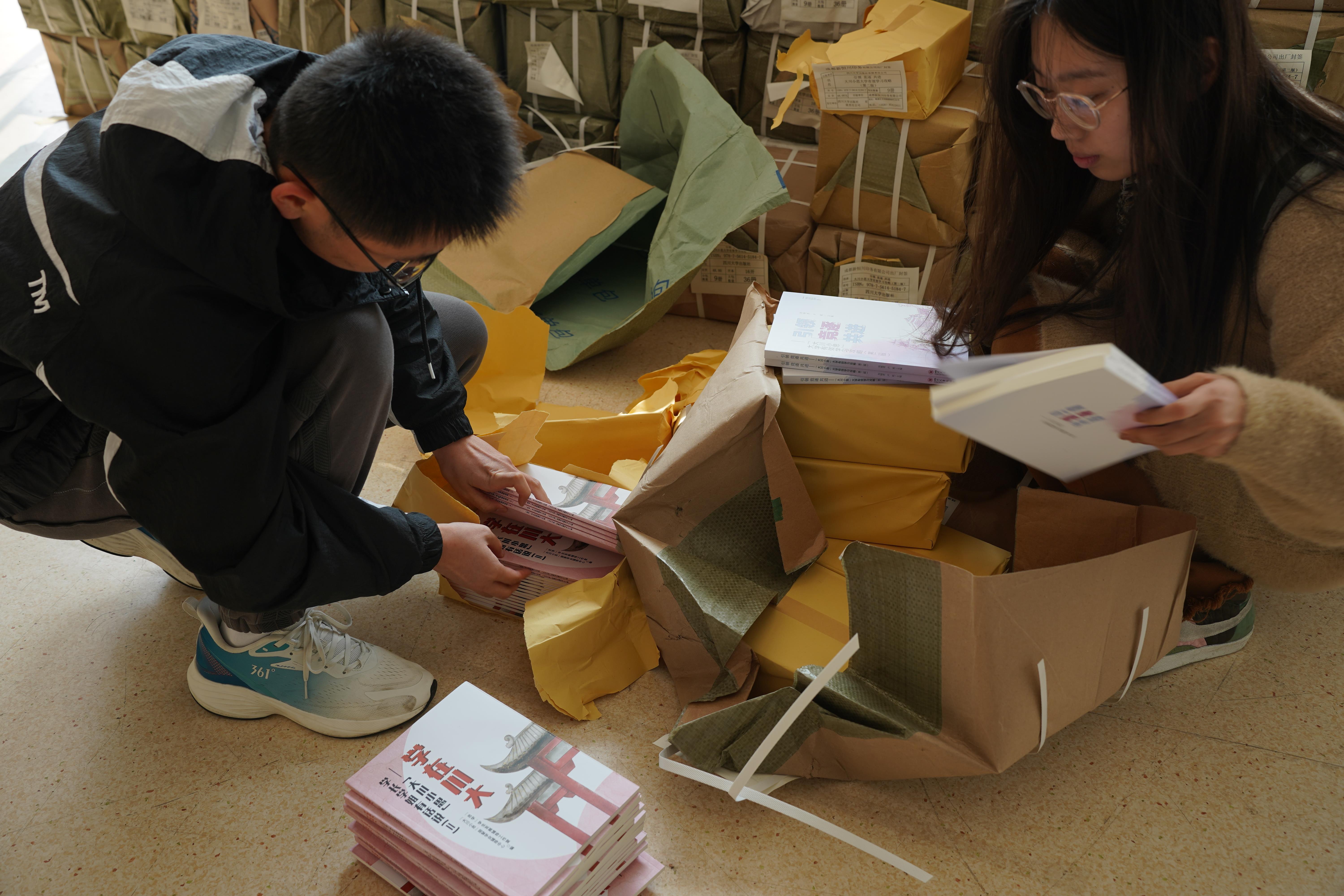 3月3日,学工部思学工作室组织“大川小思” 在学业122cc太阳集成游戏中心面向36个学院发放了由朋辈学业导师们编写出版的《引领·竞逐·共进——“大川小思”大学有效学习攻略(第2版)》以及《学在川大-“大川小思”学长学姐有话说(II)》两书,累计发放图书近2万册,覆盖2022级全体本科生。