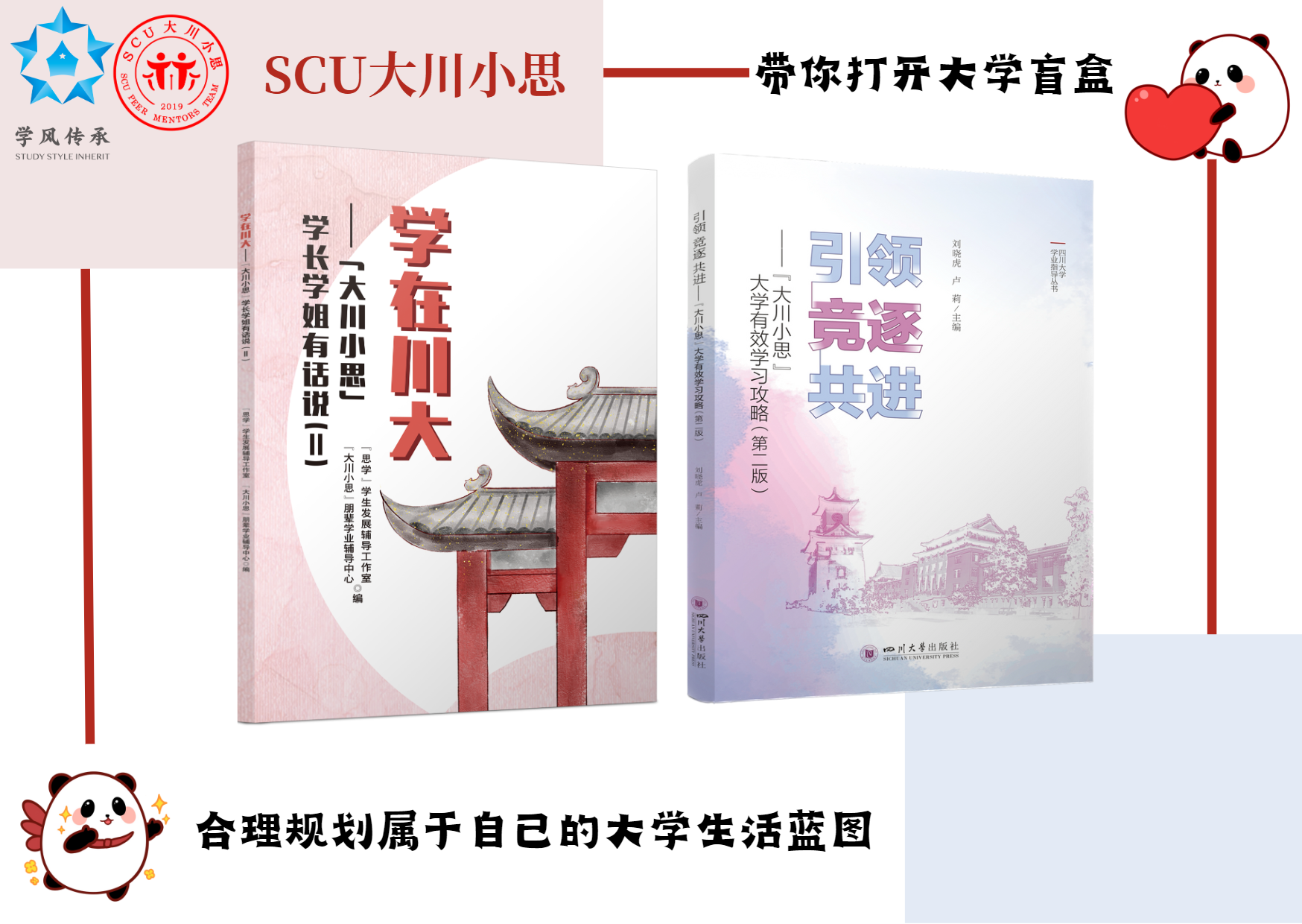 竞逐 共进-“大川小思”朋辈有效学习攻略》,并由122cc太阳集成游戏出版社公开出版向全国发行,成为全国首本大学学习指南书。这本凝聚川大优秀学长学姐学习成长智慧的学习指南书出版后,学工部即发放给当年入校的全体2020级本科生,获得良好反馈。此书每年修订,并以《引领 竞逐 共进-“大川小思”大学有效学习攻略》为名再版发放当年新生。在此基础上,思学工作室2021年组织第二届小思导师撰写“你最想给新生分享的一段大学学习生活方面的故事”汇编成《学在川大-“大川小思”学长学姐有话说》,以展现优秀学长学姐的更真实的一面,引发学生共鸣,引导学生前行。该小书每年更新,并编印发放本科新生。