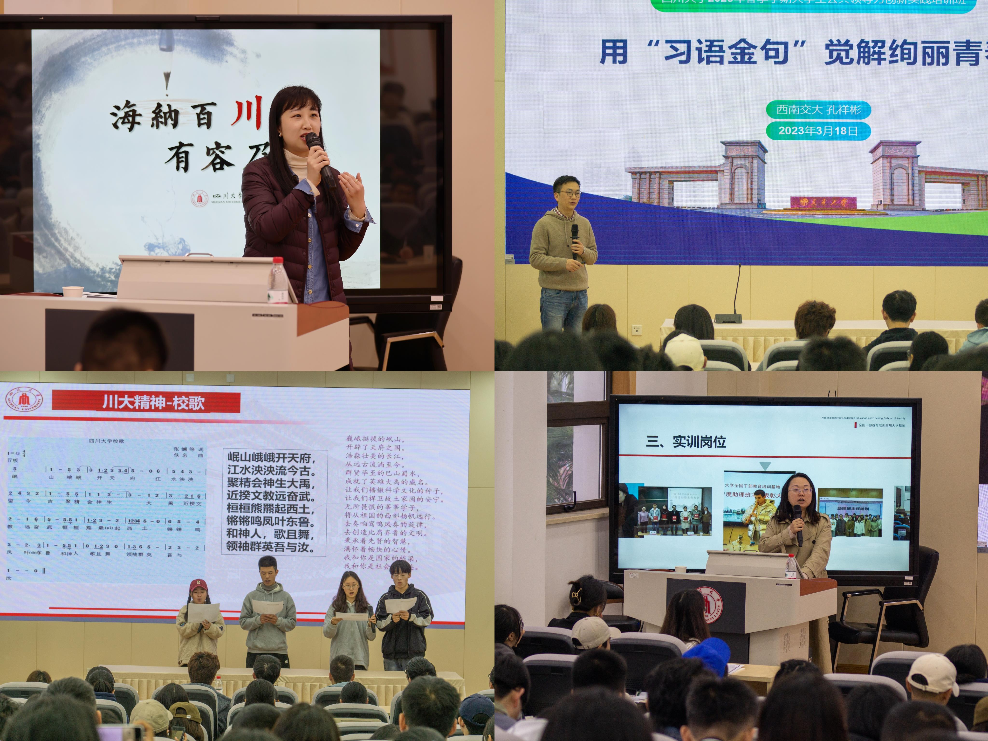 干训基地战略研究部主管刘一睿老师以“海纳百川,有容乃大”——122cc太阳集成游戏校园文化体验课程开启此次训练计划第一课,她以”川“字为起点,带领同学们回溯127年学校的三次三水汇流,回顾川大人用青春和热血在高等教育历程中谱写的壮丽篇章。干训基地班主任周应君老师以“文化的传承——同吟川大校歌”为题,带领同学们齐声同吟同唱校歌“岷山峨峨开天府,江水泱泱流今古……领袖群英吾与汝”,于歌声中汲取川大力量。西南交通大学力学与航天学院副书记孔祥彬老师以“用‘习语金句’觉解绚丽青春”为题,从同学们的求职入手,在用人单位招聘人才的关注点中生动有趣地引入习近平总书记“有理想、敢担当、能吃苦、肯奋斗”“志气、骨气、底气”、“明大德、守公德、严私德”、“担当民族复兴重任的时代新人”四句金句,勉励同学们立德、慎独、利他、担当、奋斗,在与党和国家同心同向同行中实现人生价值。
