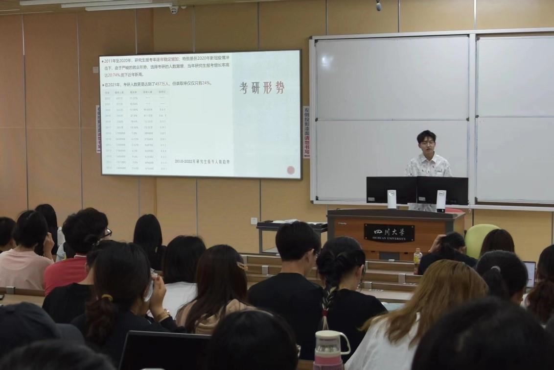“考研形势越来越严峻,各位同学需要紧密关注当下深造形势,及时做好学业规划,早做准备,才能春风得意马蹄疾,避开卷王我看行”外国语学院2021级英语专业学生姚思臣在外国语学院宣讲时向同学们分享了自己的感悟。