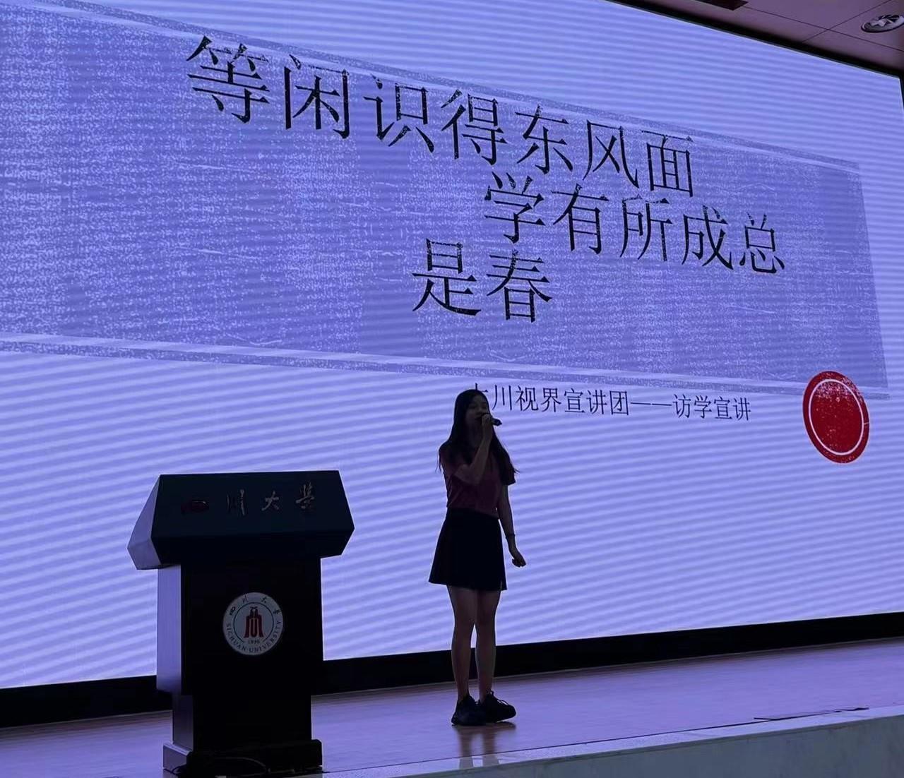 为强化我校学生学业发展规划,筑牢“志存高远”发展意识,拓宽学生国际视野,党委学生工作部成立“大川视界宣讲团”,以“大川视界”海外访学计划平台为依托,以“志存高远,脚踏实地为主题”,坚守学生为学校办学和思想引领的主体,立足学业规划和当下深造形势,深入24个学院开展大川视界宣讲33场,覆盖学生近7000人。