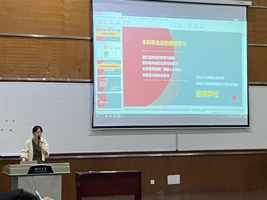 二是弘扬“脚踏实地”,以学业发展和学业规划为宣讲内容,明确学业发展规划。经济学院2021级辅导员刘峥老师为同学们宣讲了“明确深造意义,坚定未来选择”深造专题讲座,以提倡学生深造、介绍国外深造如何准备,如何应对保研和考研做了详细具体的阐述并对大家提出了建议。