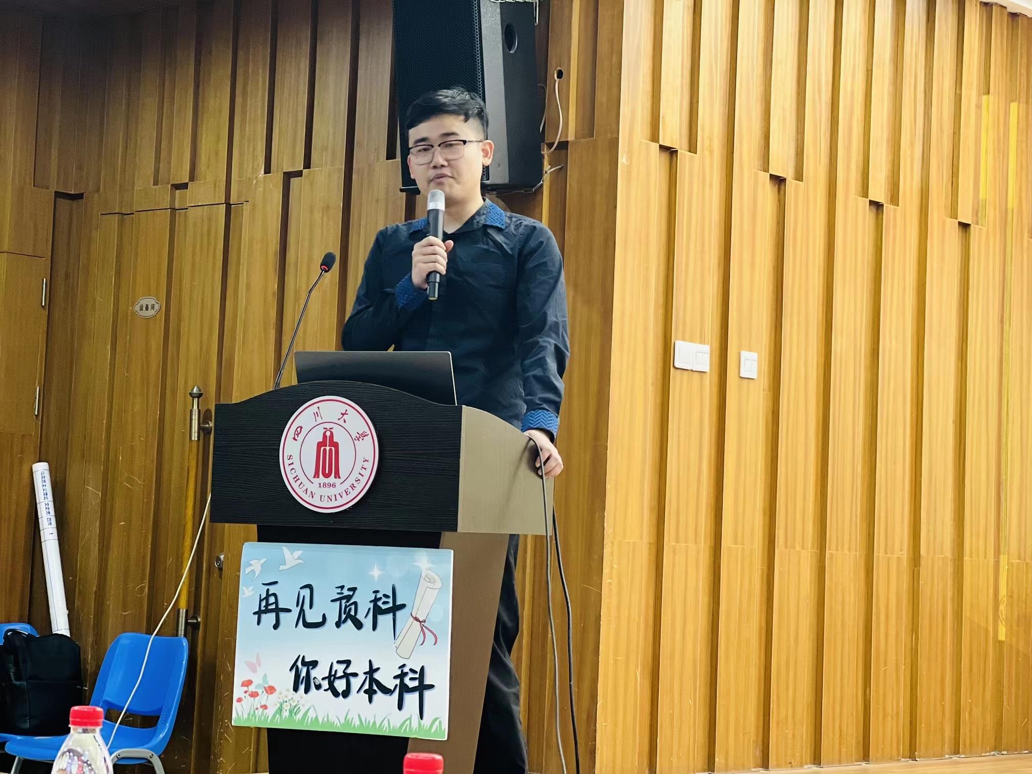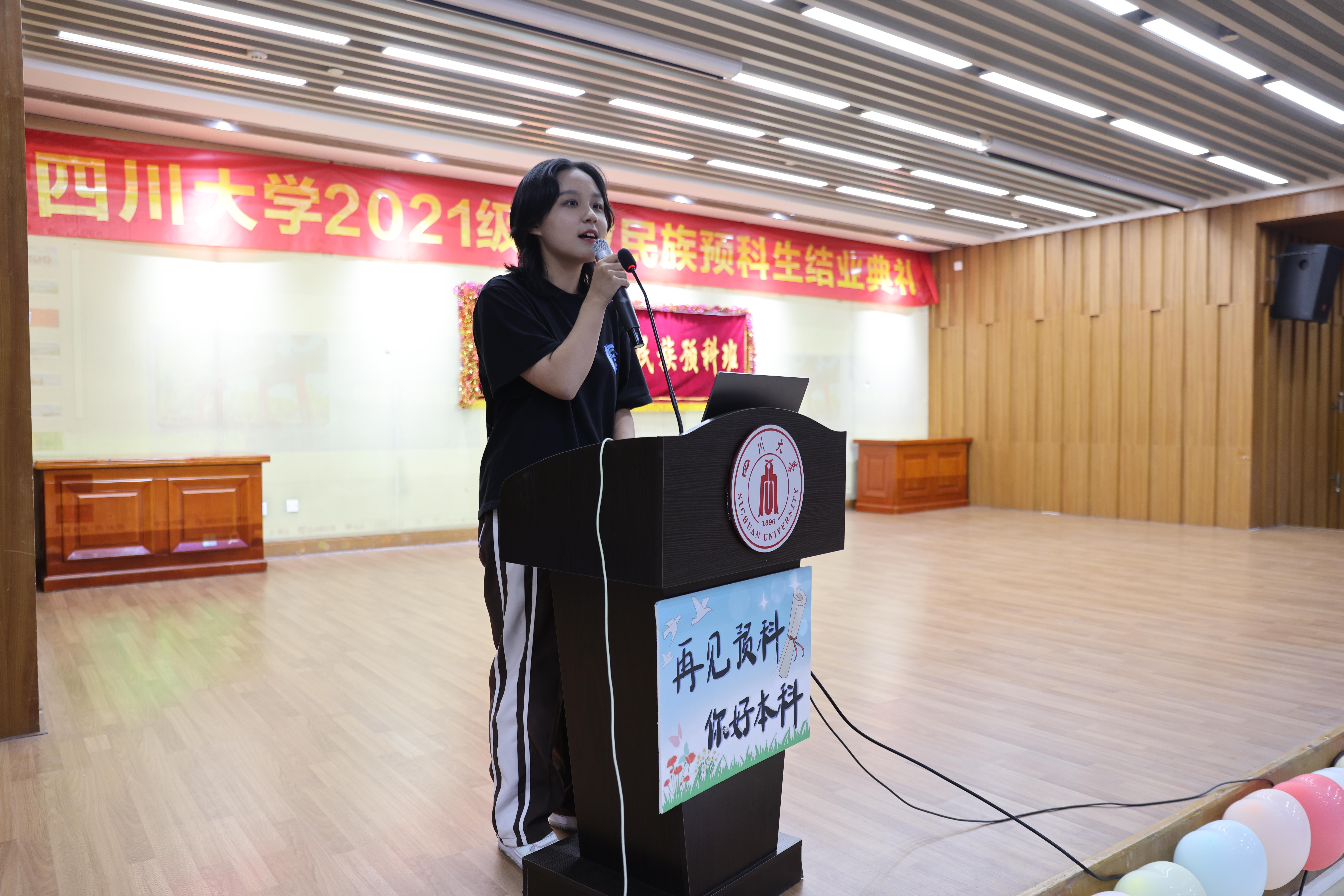 余潇同学作为学生代表,在发言中,深情回顾了预科一年同学们彼此信任、互帮互助的同学情,重拾“善行100”“映秀之行”“乐跑回家”“智跑回家”这些奋进中的美好,回味大放异彩的演讲比赛、熠熠生辉话剧比赛、别开生面的宿舍文化创意赛。余潇特别感恩在预科这趟旅途中找到独属于自己的风景,祝福同学未来闪闪发光。