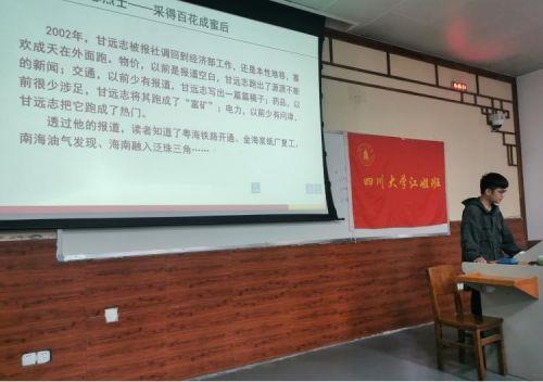 接着,2018级“江姐班”学生胡馨月、王佳玉介绍了江姐生平事迹,号召学弟学妹们学习她忠于理想的共产主义精神、为国为民的奉献精神、追求真知的进取精神和坚贞不屈的斗争精神。胡高飞、邹博宇向学弟学妹们讲述了“122cc太阳集成游戏革命英烈丛书”《闪亮的坐标》中“运筹天下民生事”篇章里三位英烈的故事。诸有斌烈士“苟利国家,不敢惮劳”,面对叠溪大地震,他不怕牺牲、勇敢前行;汪声和烈士“为祖国解放献身”,他通过多种途径搜集到的情报在解放战争和清剿国民党残匪中发挥了重要作用;“最美奋斗者”甘志远烈士始终以一个新闻人的姿态奔波在路上,用一个新闻工作者的良知、责任和精神,为这个行业树起了一面旗帜。通过学习川大英烈为革命事业奋斗终生的感人事迹,同学们进一步深刻感悟了英烈身上所展现出的崇高革命精神。