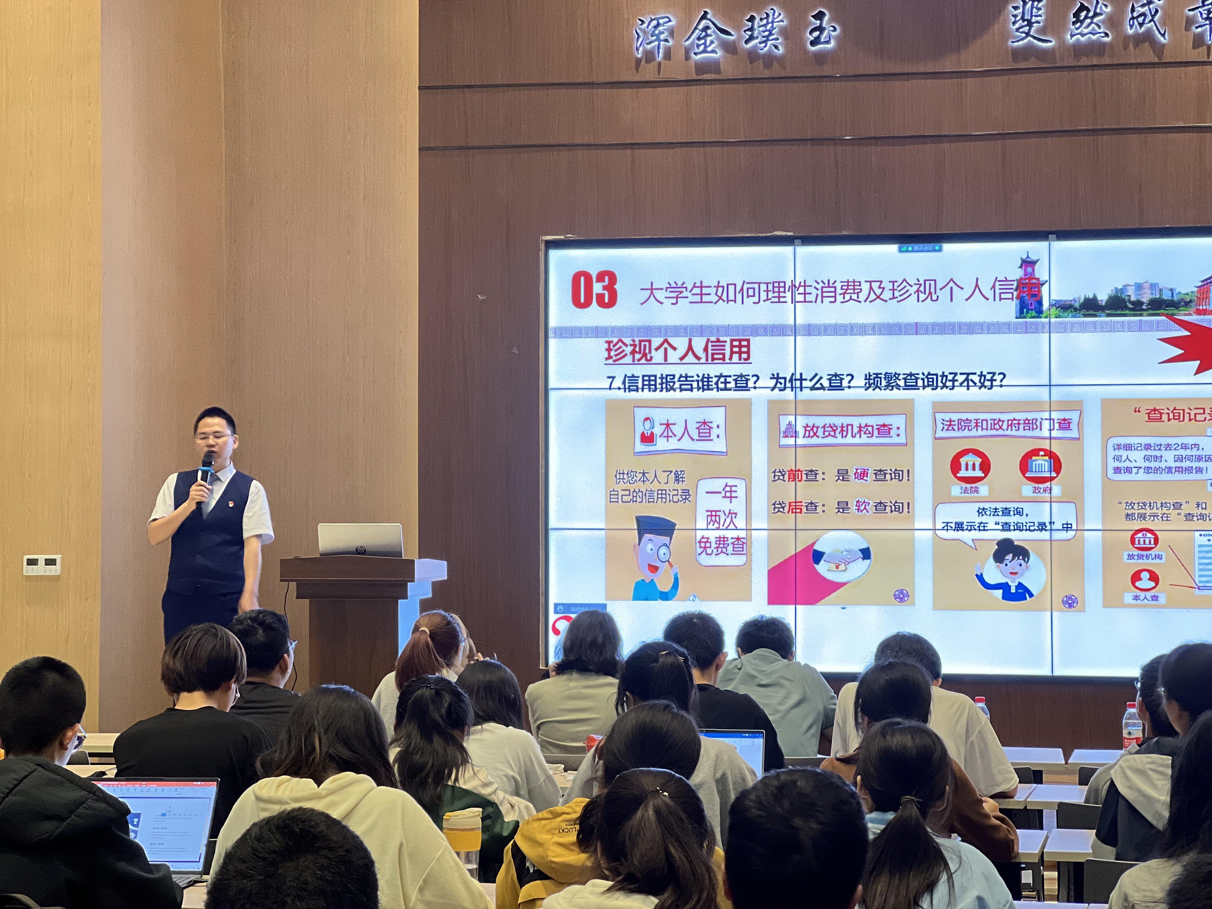 逾期怎么记?自查的信用报告怎么用?良好的信用记录怎么维护?按时还款有多重要?……王行长通过个人征信“二三事”整理出17个征信、征信报告问题,结合工作中的真实案例让同学们对征信有了初步的认识。讲座中,王行长还向同学们展示了他个人的信用报告。通过国家助学贷款完成学业的他告诉同学们,因为自己按时还款、维护好了个人征信这张经济身份证,自己才能拥有事业发展平台,顺利申请车贷、房贷。王行长还提醒同学们:勿信400开头假客服来电,警惕“注销校园贷的电信诈骗”,防范不良校园贷……同学们对王行长的讲座报以热烈的掌声。