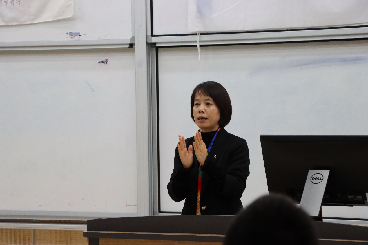 卢希芬老师在发言中分享了《自强之歌》的创作者岑加兵的故事,希望同学们像岑加兵一样,充分用好学校的资源和平台,做勇敢的自强人。卢老师还讲述了社团创立之初开展的爱心贺卡义卖、曹氏父子两亿善款扶贫行动、跑完全程等公益项目的故事,希望同学们在公益实践中践行社会主义核心价值观、涵养家国情怀,追求高度、有境界和品位的人生。