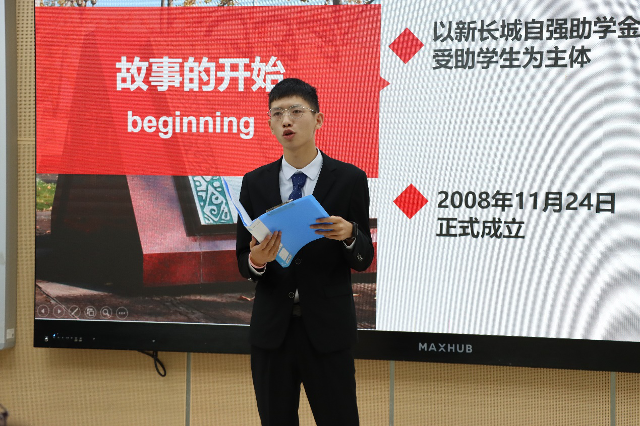 活动开始,第十四届常务社长陈孝旭就自强社的历史发展、社团构成及常规活动进行简要介绍。自强社是在中国扶贫基金会的倡导下成立、由学工部和校团委共同指导的受助学生为主体的爱心公益社团。社团自2008年成立以来,逐渐构建了六个部门、八个分社、三个中心的组织体系,拥有章程、宗旨、社刊、社歌等社团文化品牌,树立了“向阳花”作文结对、“爱心包裹”志愿劝募、“跑完全程”体育公益等品牌公益活动。社团成立13年以来,一直秉持“感恩 自强”的理念,践行“传递社会关爱,锻造自强之才”的宗旨,为受助学生提供成才支持。