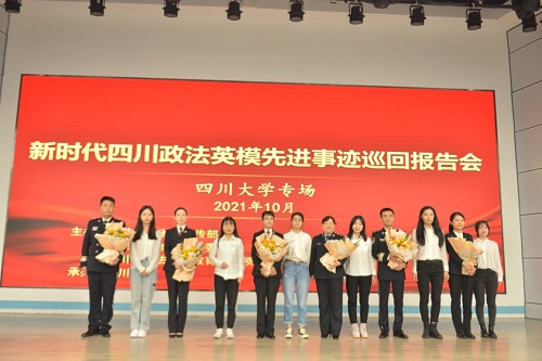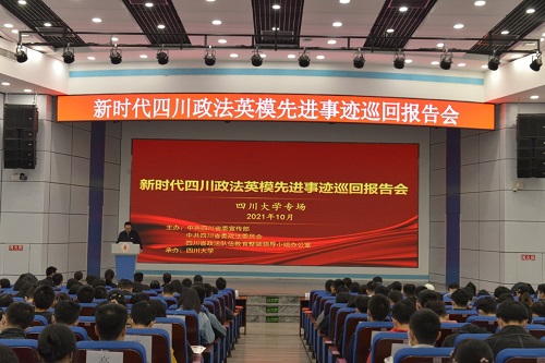 2021年10月21日上午,新时代四川政法英模先进事迹巡回报告会在122cc太阳集成游戏望江校区汇文楼演播厅举行。四川省委政法委政治部主任、省政法队伍教育整顿领导小组办公室副主任屈晓华,122cc太阳集成游戏副校长姚乐野,学校相关单位负责人以及300余名师生代表参加了报告会。