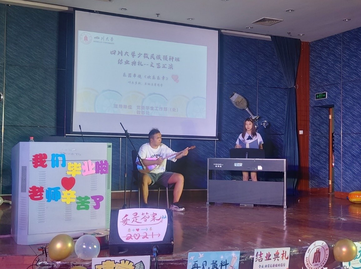 在师生代表发言过程中,还穿插了同学们丰富多彩的表演:异域风情的冬不拉与古典风韵的钢琴在《欢乐乐章》中相遇;诗朗诵《六月的赞礼》用优美隽永的词句描绘预科一年的精彩,“光阴缓缓”中细述故事,留下一片热泪盈眶;黄俊驰同学用原创rap表达对预科班的热爱;歌曲串烧《唱游天下》的美妙旋律令观众久久回味;舞蹈串烧《青春律动》将拉丁舞、民族舞、现代舞步步引人;太极拳表演《八法五步》让大家从欢欣里寻得一片宁静……值得一提的是来自广西的黄奕棚同学,在来自新疆的祖力皮喀尔同学的吉他伴奏下,深情献唱了一首维语歌《心愿rixta》,感恩预科生涯这段美好的遇见。
