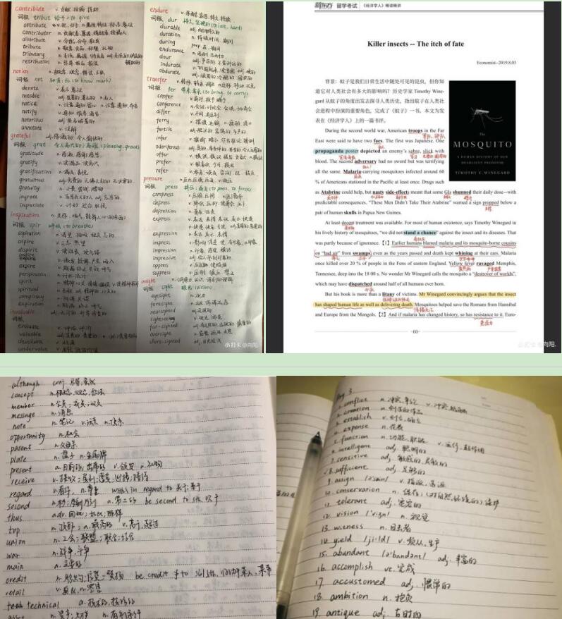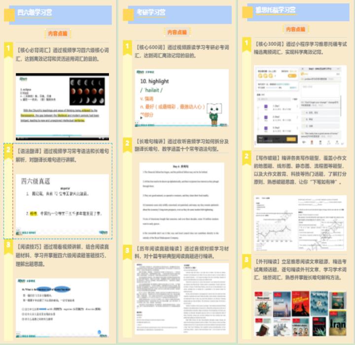 打卡活动的学习内容参照四六级、考研和雅思托福三个英语考试的不同要求,贴合考试重难点,为同学们安排学习课程表。四六级学习营中,同学们通过考试真题记忆核心词汇、练习语法翻译并掌握阅读技巧。考研学习营侧重于长难句精讲和阅读真题精读,以此提升翻译水平和阅读速度。雅思托福营将学习重点放在了阅读和写作上,写作方面结合大小作文热门话题,帮助同学们梳理破题思路,提升写作水平;还通过对外刊《经济学人》重点文章的精讲及翻译,让同学熟悉考试中阅读题形式,熟练驾驭语法难点,读懂长难句。