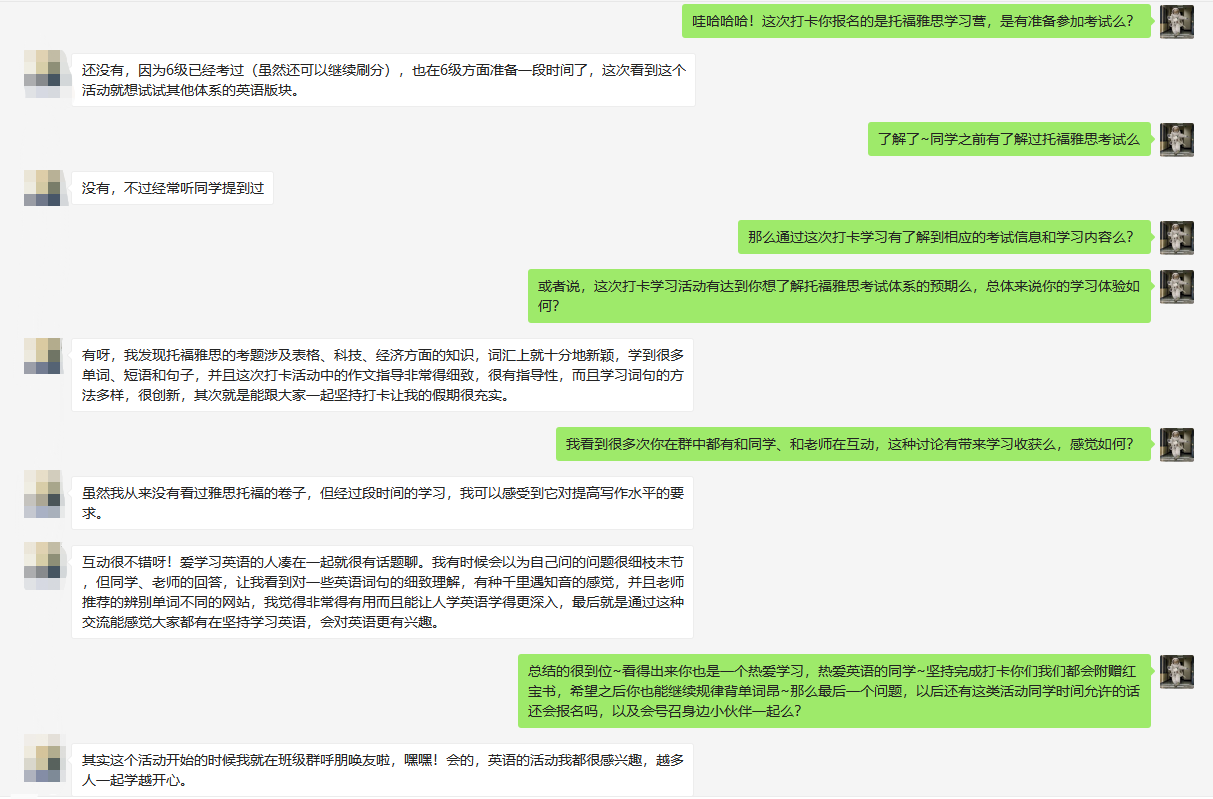 打卡活动结束后,同学们反馈良好。参加了四六级学习营的姜同学认为参与打卡活动能够帮助自己更好的安排假期学习计划。“我觉得这个活动非常好呀,因为本身在假期里作息非常不规律。但是有了这个活动以后每天能够很好地安排自己的时间。”参加了托福雅思学习营的简同学感觉本次活动的学习氛围不错,能够激发自己的学习兴趣,“互动很不错呀!爱学习英语的人凑在一起就很有话题聊。我有时候问的问题很细枝末节,但同学、老师的回答,让我看到对一些英语词句的细致理解,有种千里遇知音的感觉。这种交流能感觉大家都有在坚持学习英语,会对英语更有兴趣。”