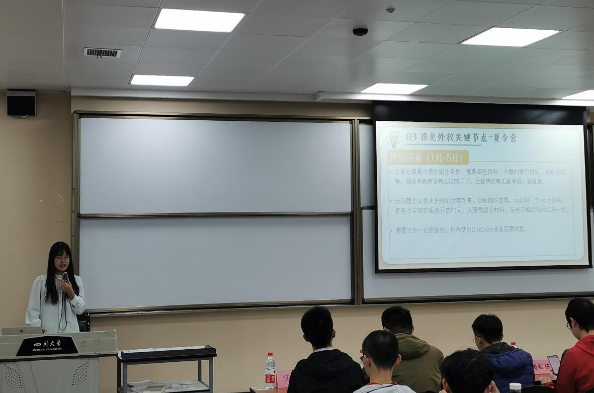 座谈会开始,“大川小思”竞赛组张凯凡学长与“大川小思”升学组庄晓怡学姐作为受邀嘉宾兼主持人,分别在望江校区分会场与江安校区分会场为同学们介绍了什么是保研、校内保研资格如何获取以及校外保研的关键节点。两位嘉宾兼主持人细致阐述了校内保研的基本要求、成绩要求和综合排名要求,并着重剖析了耗费时间更久、精力更多的校外保研的具体流程、需要做的相关准备、关键节点以及注意事项。他们指出校外保研是一场“信息战”,同学们在申请校外保研的过程中应注重信息的搜集,例如目标院校夏令营的报名时间、报名要求、考查形式以及学长学姐的经验总结等等,并可以将这些信息分类整理,方便查看。
