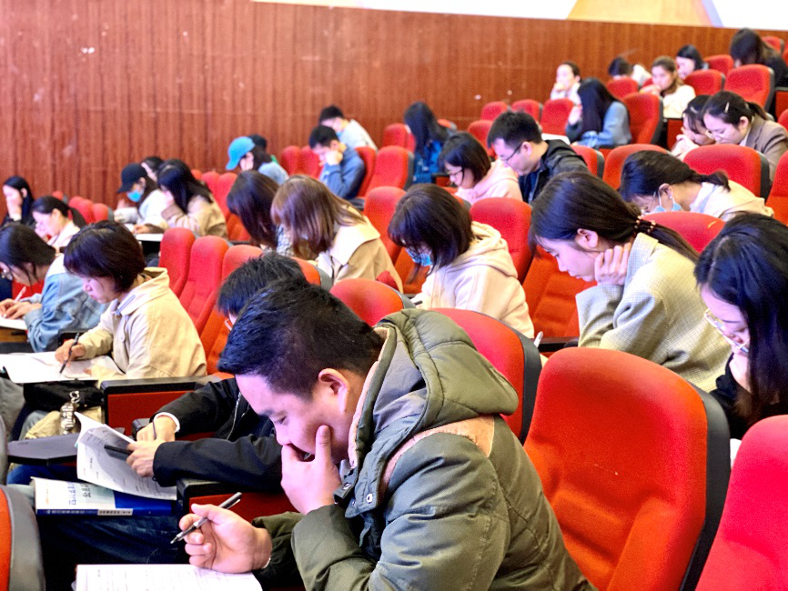 24日上午9点,在望江校区文华活动中心二楼音乐厅举办了简单的开课典礼,为期三天的培训活动正式开始。主持人简要说明课堂规定和课程安排后,中公教育李老师现场介绍了新疆、西藏省考的基本考情,并快速进入公务员考试的重难点——“数量关系”和“资料分析”的知识考点与解题技巧的讲解环节。根据安排,培训第二天由谷老师做四川省基本考情分析和“判断推理”、“语言理解与表达”板块的备考指导,最后一天由王老师带领同学们突击申论题目的解析和练习。
