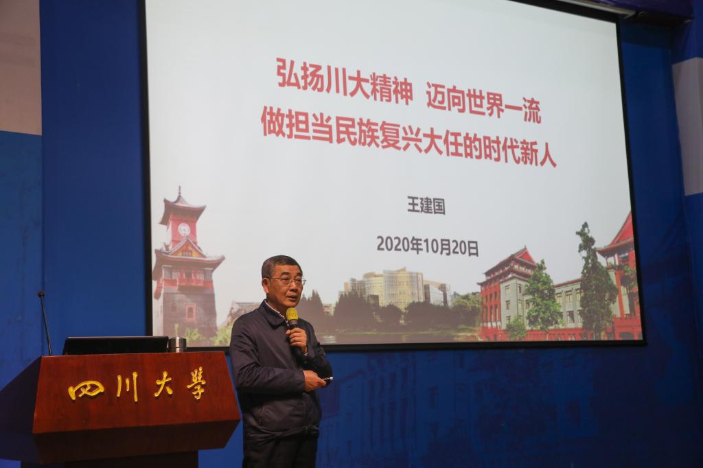 10月20日,校党委书记王建国以《弘扬川大精神 迈向世界一流 做担当民族复兴大任的时代新人》为题,为2020级本科生讲授校情校史形势教育第一课。校党委副书记曹萍、郭勇,学校相关部门负责人,马克思主义学院思想政治理论课教师,新生辅导员代表和400余名2020级本科新生参加听课。