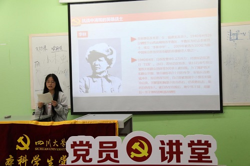 活动开始,首先是“党员讲堂”环节。支部党员苏慧同志讲述了知名革命校友江姐等人的光辉事迹,并号召支部全体党员坚定理想信念、练就过硬本领、锤炼品德修为,矢志不渝投身新时代中国特色社会主义强国伟业,发挥好共产党员的先锋模范作用。