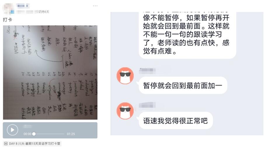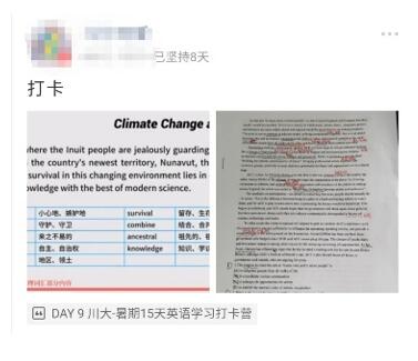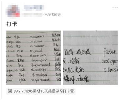 8月,学工部学生122cc太阳集成游戏中心联合成都新东方,通过线上社群及打卡小程序平台,顺利开展了为期十五天的暑期英语学习打卡活动。本次活动虽在暑期进行,但也得到了同学们的热情响应,共计五十余位同学报名参加了此次活动,营造了积极的线上学习氛围,帮助同学们在假期也坚持英语学习。