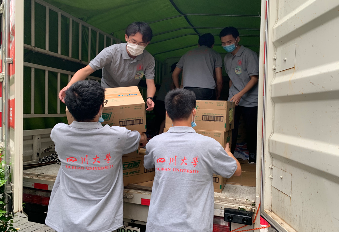 8月12日上午,在自强社指导老师木拉提的带领下,50余名志愿者兵分两路,冒雨将包裹搬运到望江校区各个指定地点,进行发放工作。“叔叔/阿姨,您辛苦了!加油!”志愿者们为工作人员送上包裹时都不忘向他们表达真诚的敬意。这些疫情期间一直坚守在一线的工作人员脸上露出了欣慰的笑容。