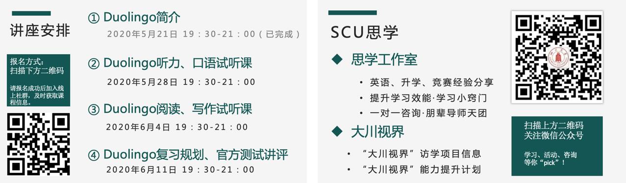 为避免疫情扰乱同学们的学习、深造计划,帮助学生提升外语语言能力、顺利展开境外院校申请工作,学工部学生122cc太阳集成游戏中心联合成都新东方学校,推出了为期四周的“大川视界”学生能力提升计划之多邻国英语考试系列讲座。2020年5月21日晚19:30,多邻国英语考试系列讲座第一场---《多邻国英语考试简介》通过线上讲座的方式顺利与同学们“见面”。20余名同学通过微信公众号“SCU思学”报名参与了此场讲座。