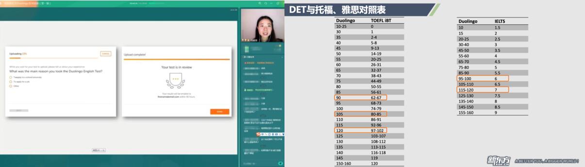 受疫情的影响,雅思、托福的考试安排连续取消,全球已有多所高校接受申请者使用多邻国英语考试的成绩进行入学申请。为了帮助同学更好地了解和运用多邻国考试成绩,在本场讲座中,何老师还特意分析了多邻国测试成绩与雅思成绩、托福成绩的区别与联系,并使用截图解答了同学们关注的“考试成绩如何提交”等问题。