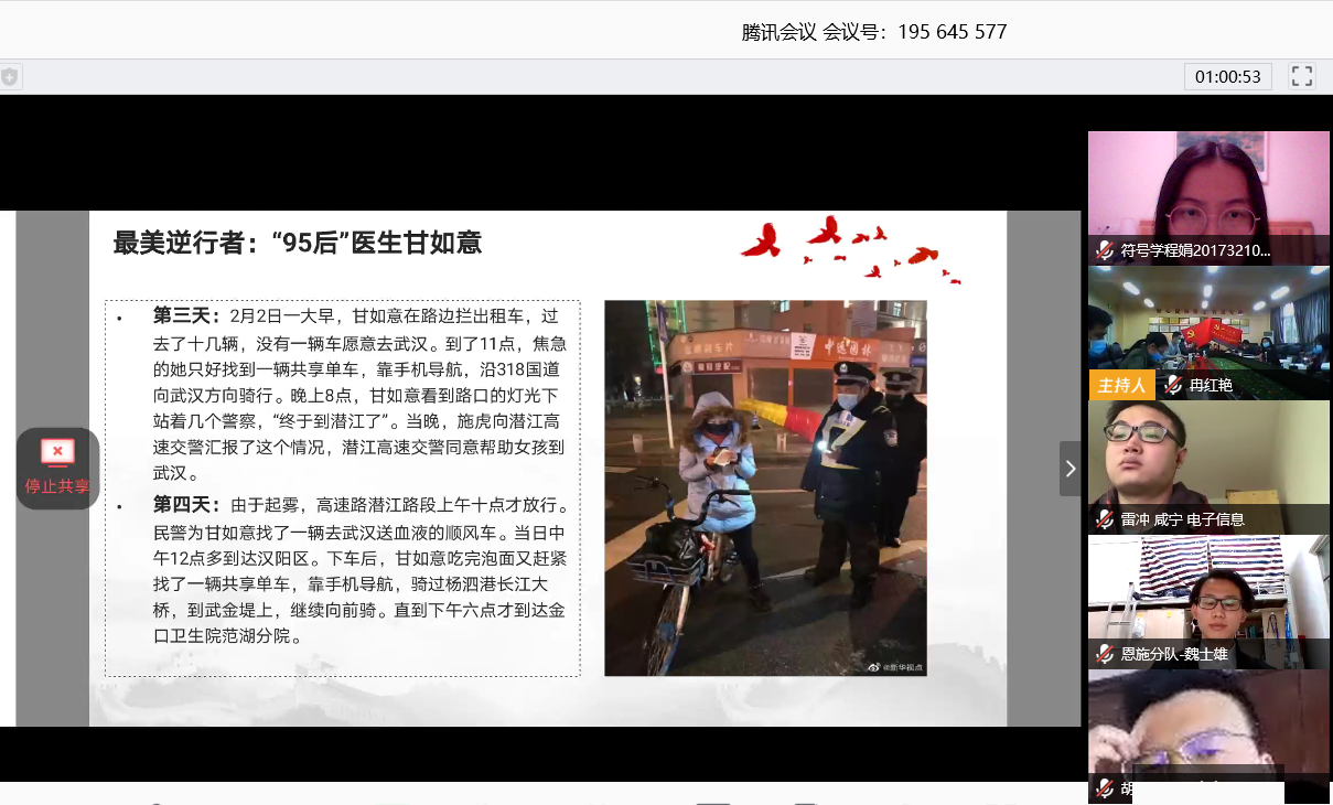 化学工程学院本科生张一戈寒假跟随母亲到武汉,不料母亲确诊新冠肺炎被隔离治疗,他一个人住在临时租的房子里,同在武汉江岸区的化学学院2017级硕士党员赵挺了解到这一情况后,主动联系到张一戈,关心其学习和生活状况,鼓励和帮助他战胜困难。