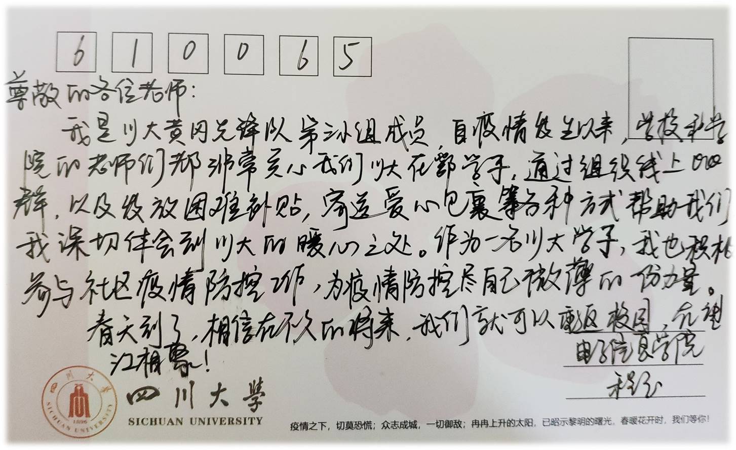 疫情发生以来,川大师生的健康和平安,是学校最大的牵挂,身处疫情中心的湖北学子更是学校关心的重点对象。全校师生一直记挂着湖北的川大学子们。前段时间,学校还特别为1754名湖北学生邮寄了抗疫爱心包,在收到爱心包后,同学们纷纷在学校邮寄的明信片上写下发自肺腑的文字,并推荐武汉的张夏维和张楷旸两名同学代表大家向学校表达感恩之心和思念之情。