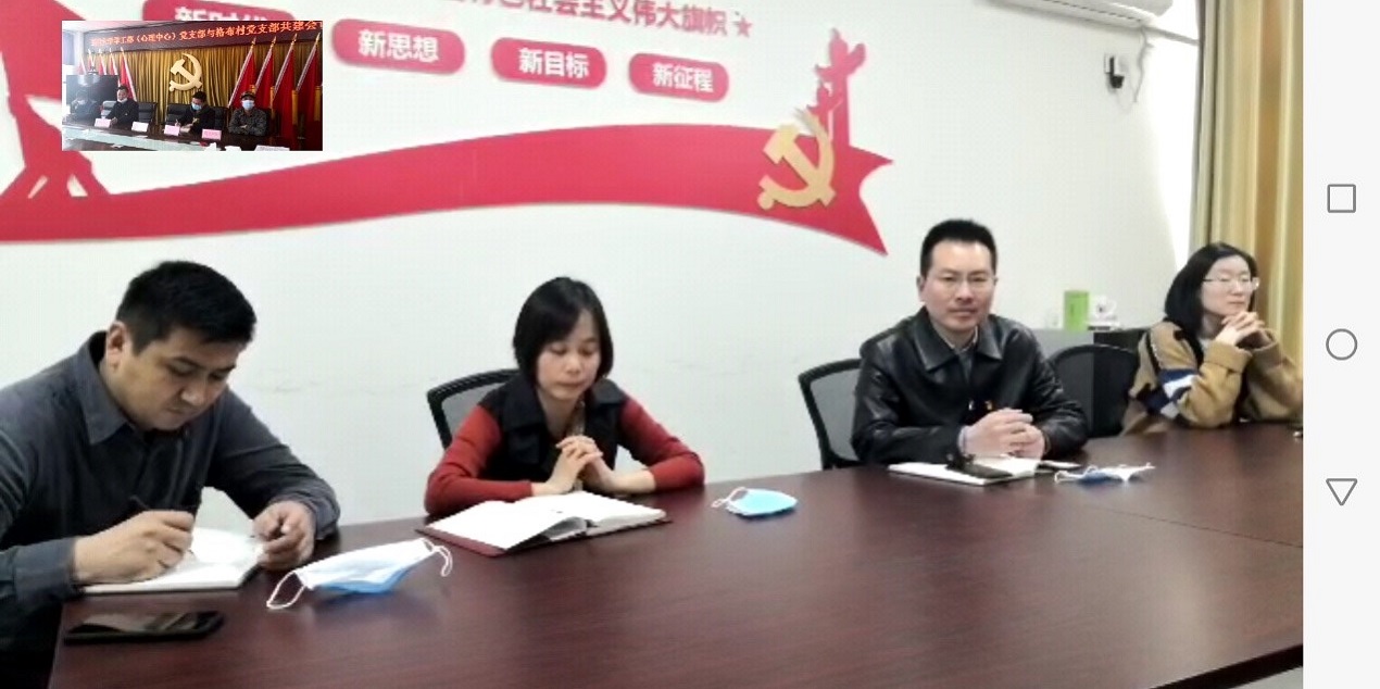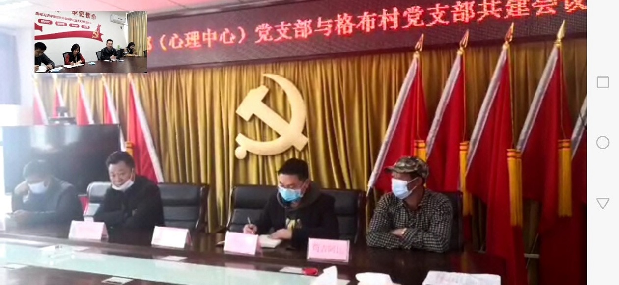 为进一步全面贯彻落实习近平扶贫思想和关于新冠肺炎疫情防控系列重要讲话精神,充分调动和发挥基层党组织的战斗堡垒作用和党员干部的先锋模范作用,助推甘洛县格布村打赢脱贫攻坚战和新冠肺炎疫情防控战,2020年3月24日下午,学生工作部(心理健康教育中心)党支部与甘洛县格布村党支部召开共建视频会议,就新冠肺炎疫情防控工作进行了沟通,就2020年支部共建以助力脱贫攻坚等工作进行了研讨,两个党支部的支部书记以及党员代表参加了此次视频会议。