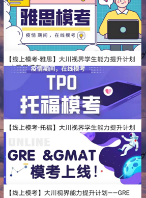 托福、雅思和GRE等模考都是采用的贴近真实考试难度的题目,进行线上模考,让学生能够提前体验考试流程、把握考试难度。托福的TPO(TOEFL Practice Online)是由托福官方出题机构ETS为考生们提供的最具权威的真实模考测试,全真还原托福考试,考试题目是选取TPO官方最新版套题,其难度和算法与真实考试非常接近。雅思模考的题目从雅思真题题库里选取,题目难度跟近年来雅思考试真题难度相当,作文题目也是选取的近年常考热点题目,之前有学生在考场上遇到过模考原题,大大提高做题效率,实现总分提分。GRE全真模考选取了GRE官方考试真题,采用机考的形式,全真还原了GRE考试场景,考试内容共分为写作、词汇、数学三部分,考试时长为3个小时。