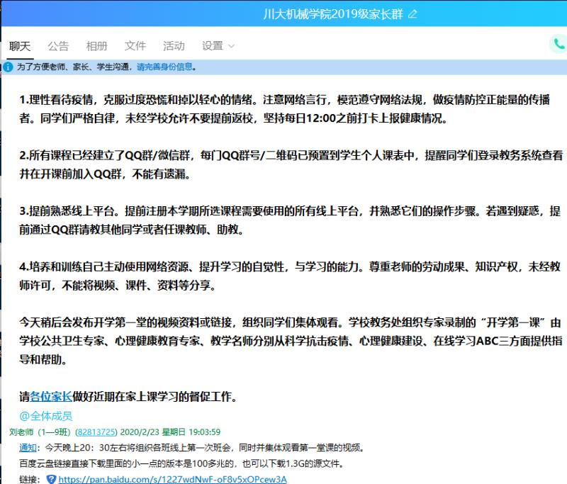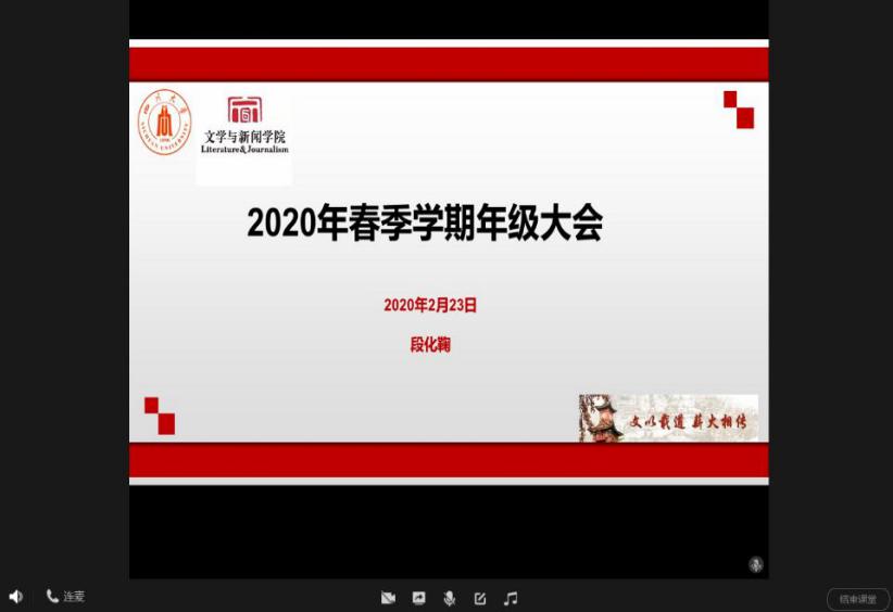 2月23日,学校287名辅导员与全校近6万名同学共同开启了线上“开学第一课”。同学们久别“重逢”、师生热情高涨、气氛相当热烈。“开学第一课”是在党委学工部、教务处、各级学院党委的关心和指导下,由各学院学生工作组精心组织,以全体辅导员通过线上年级大会的形式开展。辅导员老师认真备课,反复测试,为通过各类网络直播平台、QQ群、微信群等开展线上课程做好了充分的准备,身先示范,以自己饱满的热情引领学生投入到新学期的学习。课上传达了学校、学院和老师们对同学们的牵挂、关爱与期许,也为学生们答疑解惑,鼓劲打气!学校邀请公共卫生、心理健康方面的专家和教学名师录制课程视频,分别从科学抗击疫情、心理健康建设、在线学习三方面为同学们提供指导和帮助。辅导员老师们与同学们一同观看并讲解了学校精心准备的《开学第一课》,同学们看后纷纷表达,深受感染与鼓舞,一定“停课不停学”,在家严格自律、努力学习。