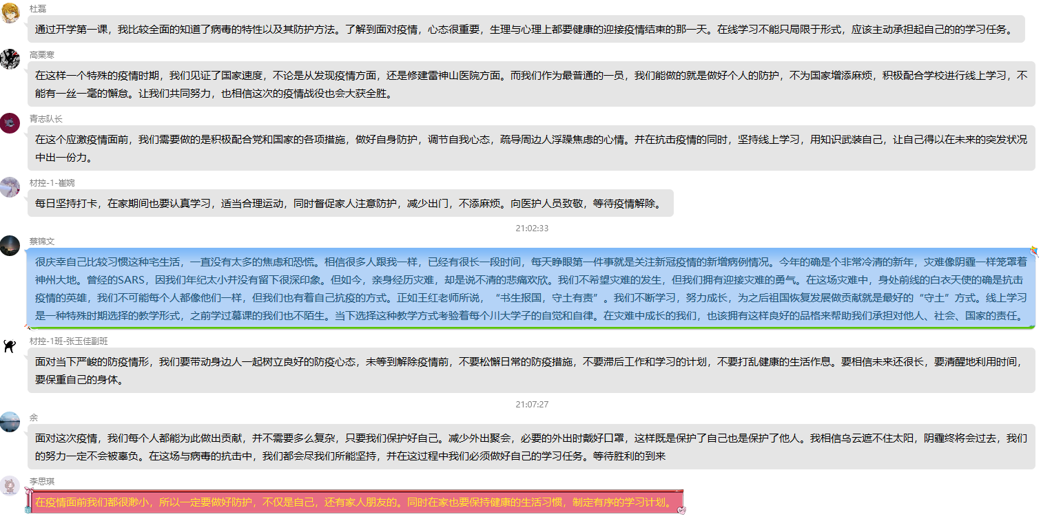 《开学第一课》后,同学们纷纷发表感想。2017级本科汉语言文学专业刘玏说:“川大开学第一课,裴晓芳教授从医学角度讲授了新型冠状病毒感染人类的作用机理,以及如何科学防范新冠肺炎;李涛教授带领我们科学认识疫情之下我们的情绪和身体上的变化,及如何调整好自己的心理状态;王红教授与我们分享了线上学习的心得,帮助我们更好地适应心得学习模式。在这个不同寻常的春天,我们作为川大学子,应该积极作为承担抗击疫情的青年责任”。2017级本科网络与新媒体专业刘雨凡说:“开学第一课让我认识到,国家确实都是在集中力量办大事,建造火神山、雷神山医院,组织多支医疗队参与治疗新冠病毒患者。这一切都体现了社会主义的优越性。前线的医生们有些也献出了自己的生命,这一切都让我们感动,我们自己作为青年一代学子,也应该有所担当,做自己能做的事情,适当参与志愿活动,在国家危难之际奉献自己的一份力量。现在开学了,就好好学习,每日按时打卡,让自己身心健康,也算是为这场战“疫”做出的努力了。”