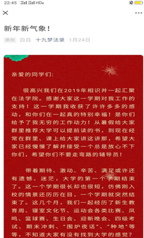 疫情防控期间,法学院辅导员白宝芬希望同学们不论在哪都能实实在在够感受到家的温暖。腊月二十九这天,她和学院同事一道为留校同学们送去了“旺旺大礼包”和新年“压岁钱”。她在给全体大一同学的信中深情地写到,“希望大家已经慢慢了解并接受一个总是放心不下你们,希望你们不要走弯路的辅导员!”字里行间,浓浓的暖意流淌在每个同学心里。法学院辅导员李晓迎和兼职辅导员王宏举在线分享公共资源、免费数据库,让同学们在抗疫期间能有效获取学习资源,不致耽误学业。同时,提供学校读书活动投稿信息,丰富同学们的“宅”生活。