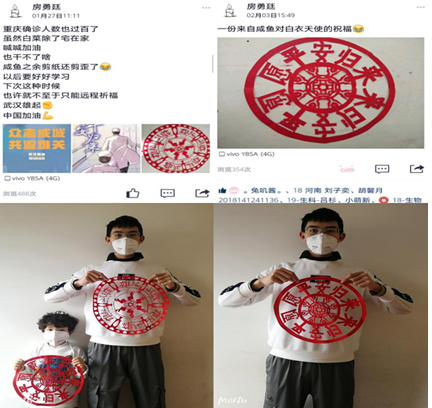 生命科学学院“江姐班”辅导员何韵云,与学院党委副书记吴近名、学生科长徐雅走访慰问了寒假留校的大一新生。了解到该生的返乡计划,何老师反复叮嘱同学旅途中严格佩戴口罩、做好自我防护。在新冠病毒的肺炎疫情I级响应措施启动后,何老师积极开展线上学生工作,转发学校相关重要通知,安抚学生情绪,及时和家长保持沟通。在工作之余认真完成网络课程的学习和备课,编发各种温情暖心话语鼓励同学们“内涵宅家”。“何姐姐”通过QQ空间动态欣慰地发现,原来“江姐班”的小朋友们早已行动起来,通过力所能及的防疫志愿宣传和原创手工作品,用“红专精神”感染、服务着身边的人们!
