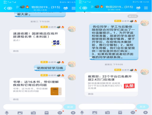 物理学院辅导员谷芳蕊为了不让同学们漫长的“宅家”消磨掉意志,结合放假前布置的“寒假一本书”任务,鼓励同学们认真阅读好书。同时,及时有效引导班级同学的自发筹集善款和物资支援华西医院的义举,让爱心不要落单。
