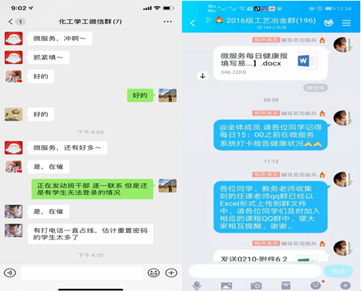 除此之外,辅导员老师们还带上了专属助手小薇——川大微服务,微服务上“健康每日报”也是他们疫情期间日常提醒工作之一。“同学们记得上报今日信息”、“今天,你打卡了吗”等等话语成了老师每日最多发言,一个个QQ群的“龙王”辅导员应运而生,而老师们关切的心始终如一。