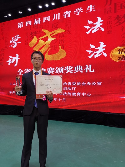 10月13日,由四川省委全面依法治省委员会办公室、省教育厅、省司法厅主办,四川师范大学、教育部青少年法治教育中心承办的第四届四川省学生“学宪法 讲宪法”活动决赛暨颁奖仪式在四川师范大学成龙校区龙湖剧场举行。经过激烈角逐,由我校党委学生工作部和法学院共同选培的、代表我校参赛的吴玉章学院2018级“卓越法律人才计划”涉外实验班本科生李玉柳发挥出色,力压群雄,荣获法治知识竞赛高校组冠军。