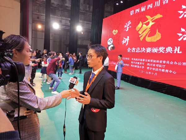 赛后,在接受四川卫视科教频道记者采访时,李玉柳同学表示,“比赛中其他选手对宪法全面的了解给了我很大的压力,这种压力同时也体现了他们对宪法细致且深入的学习。很高兴这次能够与这些优秀的选手同台竞赛,这也激励我未来将更努力地进行宪法以及其他部门法的深入学习。”荣获全省总冠军后,李玉柳同学将在今年12月初奔赴北京,与其他各年龄组冠军一道,代表我省参加全国学生“学宪法 讲宪法”竞赛,预祝他再获佳绩、为校争光。