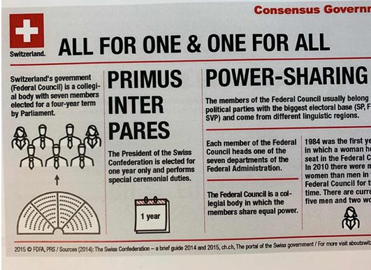 8月20日,弗里堡大学历史系的Dr.Bernhard Altermatt向同学们介绍了瑞士的历史与政治。瑞士由26个州组成,真正的权力源自七席联邦委员会,由国家七个机关的部长(包括现任联邦主席)组织构成。联邦委员会全体成员集体作为国家元首。联邦主席由联邦委员会七名委员轮任,对外代表瑞士,任期一年。