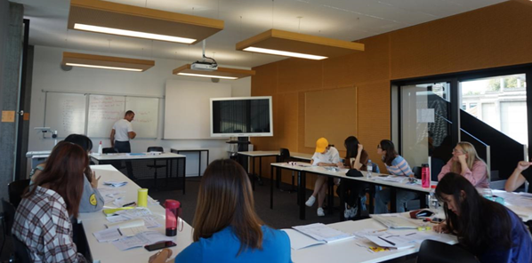 集中学习阶段,根据德语基础的差异,同学们被分到了A1和A1+两个不同的班级接受教学。由于正处于弗里堡大学学前密集语言课开课时间,同学们得以与各个国家的留学生一同参加德语课程。由于文化教育背景的差异,欧洲大陆语言教学同国内语言教学有不小的差异,作为教授德语的课堂,整节课都使用德语教学,这对于不少第一次接触德语的同学是个不小的挑战。同学们在纯正的德语的环境下进行了四天的学习,借鉴各自语言学习的经验最终顺利地完成了德语课的学习。在8月30日下午,所有同学一同参加了密集语言学习课程的考试,并且最终全部合格,成绩优异,得到了弗里堡大学颁发的学习结业证书。