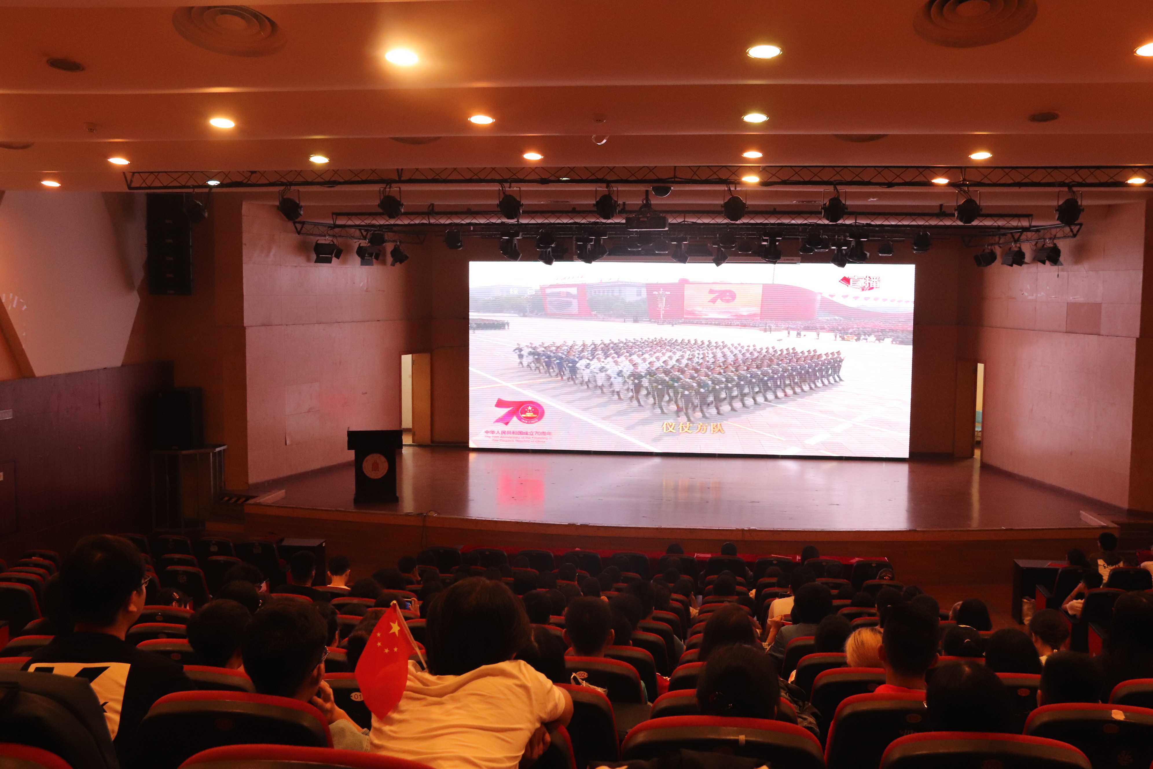 10月1日上午,师生代表齐聚望江校区文华活动中心二楼音乐厅,观看庆祝大会、阅兵式和群众游行,共同见证伟大祖国的繁荣与富强。馨心社一位社员表示:“今天是伟大的祖国母亲的生日,也是馨心社的生日,能够以观看国庆庆典的方式为我们的‘大家’和‘小家’共同庆生,我感到非常自豪与感动。”