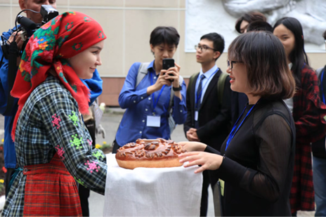 随后,俄方学校以俄罗斯习俗中迎接尊敬、高贵客人的传统礼节——“面包蘸盐”表达对中方客人的欢迎。一位穿着民族服装的俄罗斯姑娘,手捧面包和盐皿,款款向客人走来,全体成员每个人手撕一块面包、轻蘸少许盐巴,送入口中,仪式才算圆满完成。