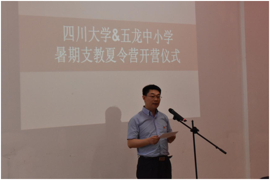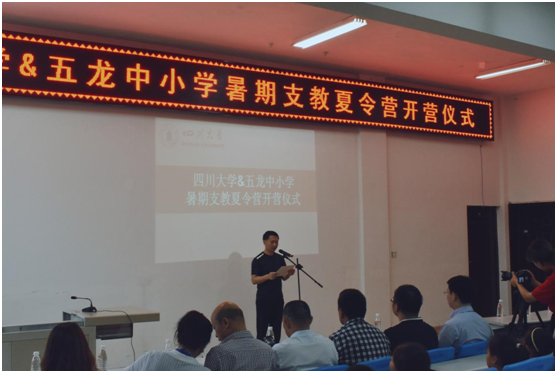 在《春风十里》柔美的旋律下,五龙镇党委书记胡波的致辞揭开了开营仪式的序幕。他首先指出教育建设是乡村振兴建设的支点;同时他也热烈欢迎川大的志愿者们前来进行支教活动,这不仅为五龙镇的教育注入了新鲜血液,也能够增强同学们的团队意识并锻炼优良品格、刻苦和自强不息的精神。