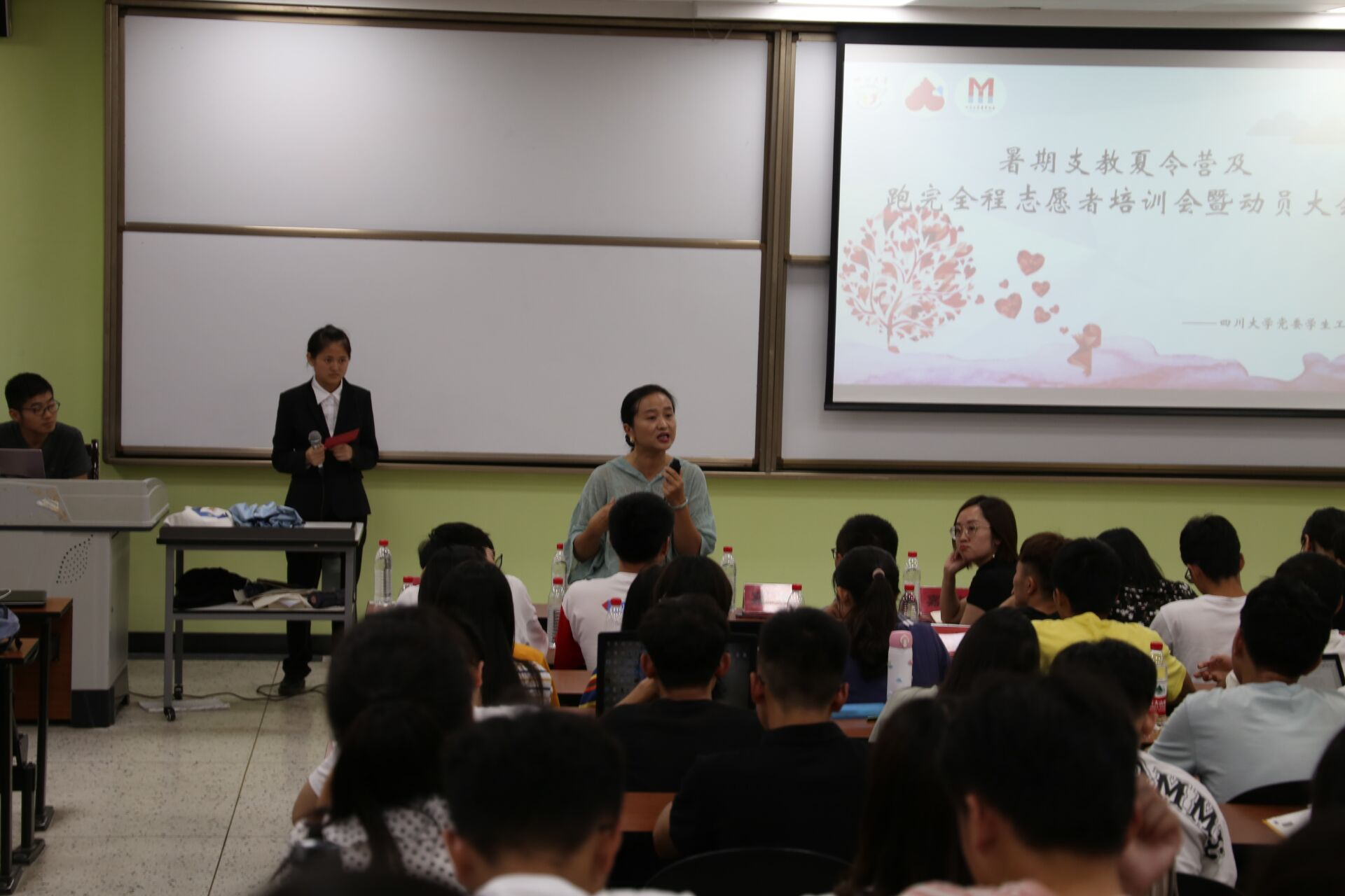 为提高爱心公益社团暑期社会实践开展成效,提升社会实践志愿者的公益意识与综合素质能力,6月30日晚,由学工部学生资助中心主办的2019年学工部爱心公益社团暑期社会实践志愿者培训会在江安校区一教B301举行。学工部副部长卢希芬,马克思主义学院、“五彩石”志愿团指导老师李琰,学工部学生资助中心副主任、馨心社指导老师刘程,自强社指导老师木拉提,自强社、翼梦协会及馨心社等爱心公益社团的110余名志愿者参加了本次培训会。