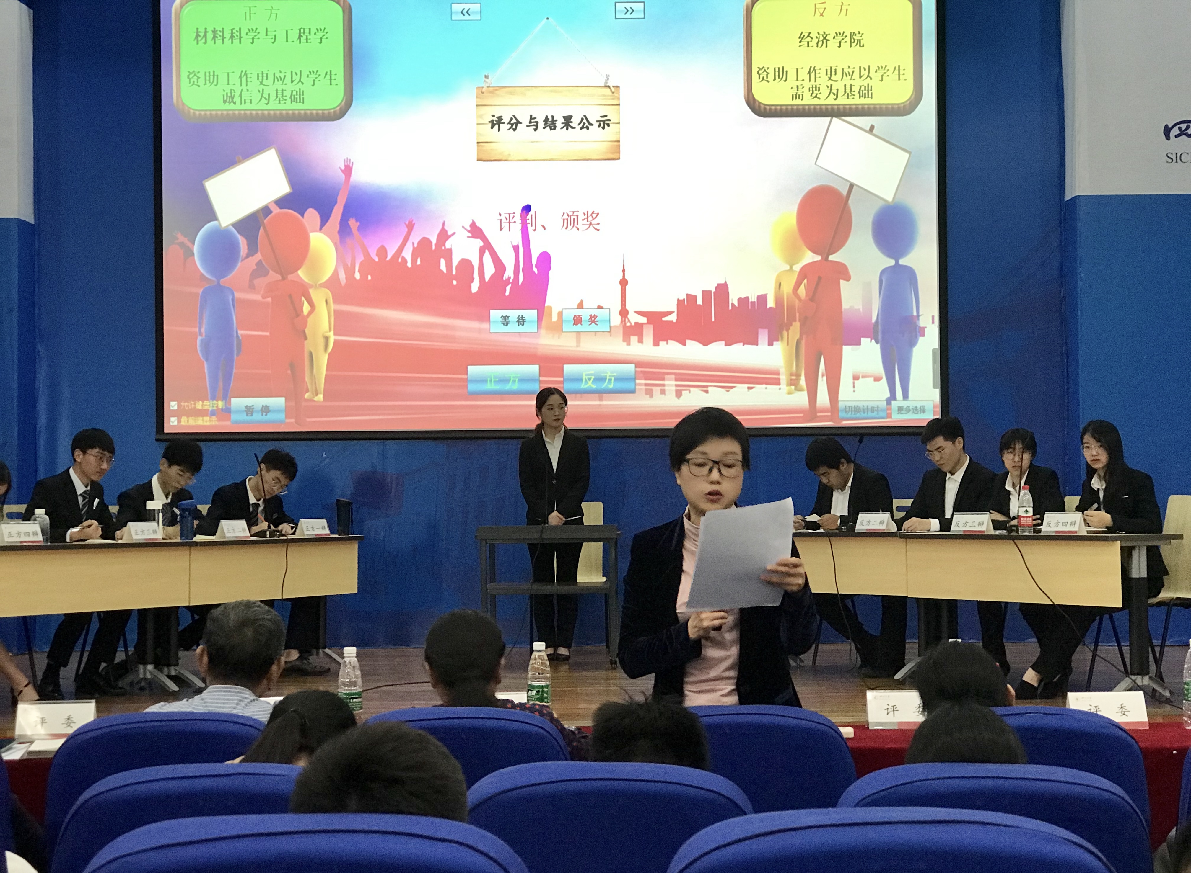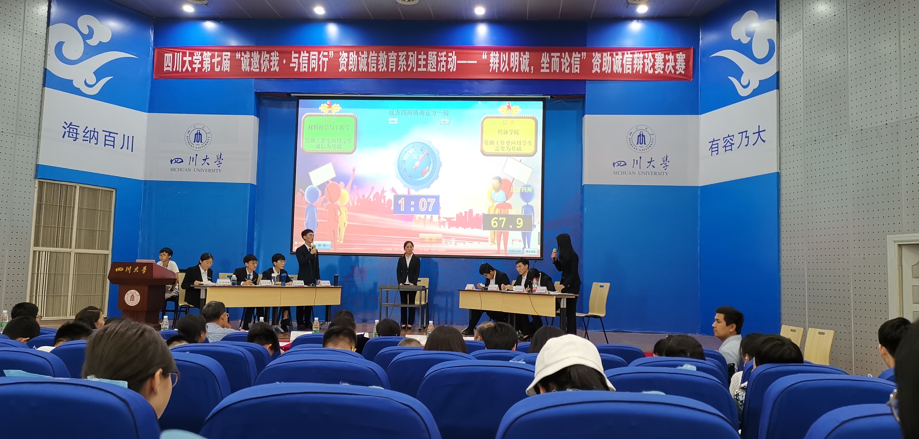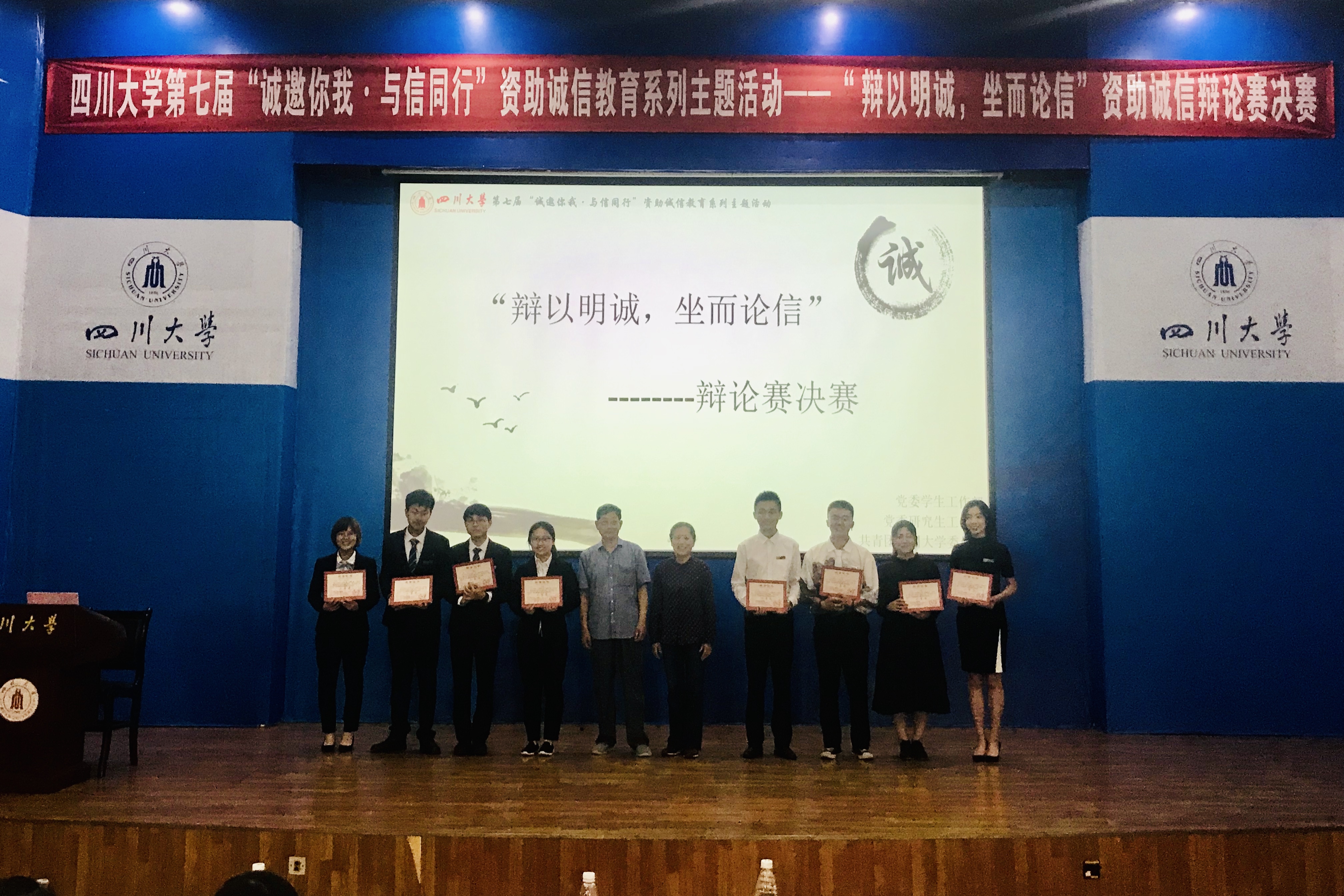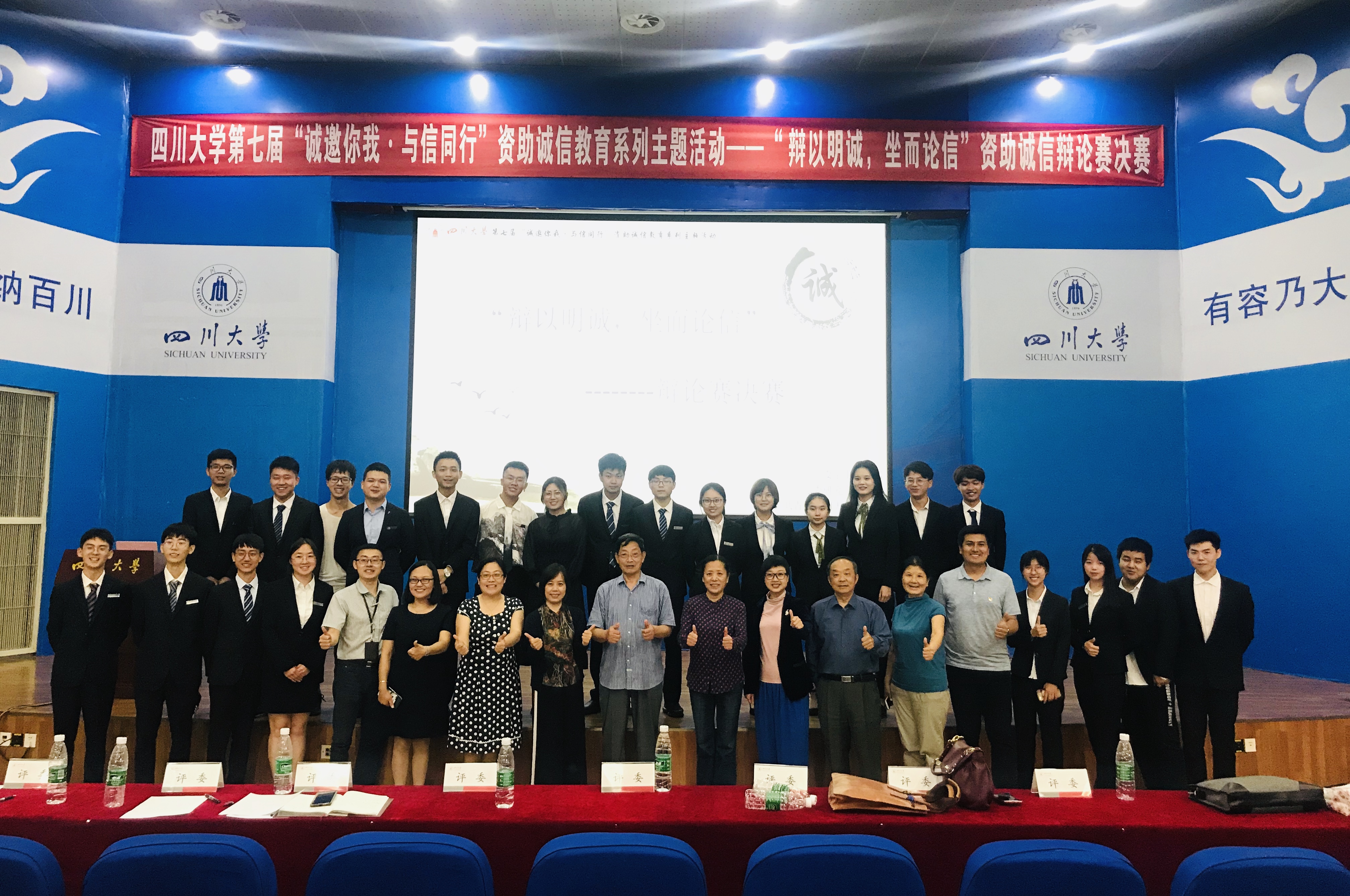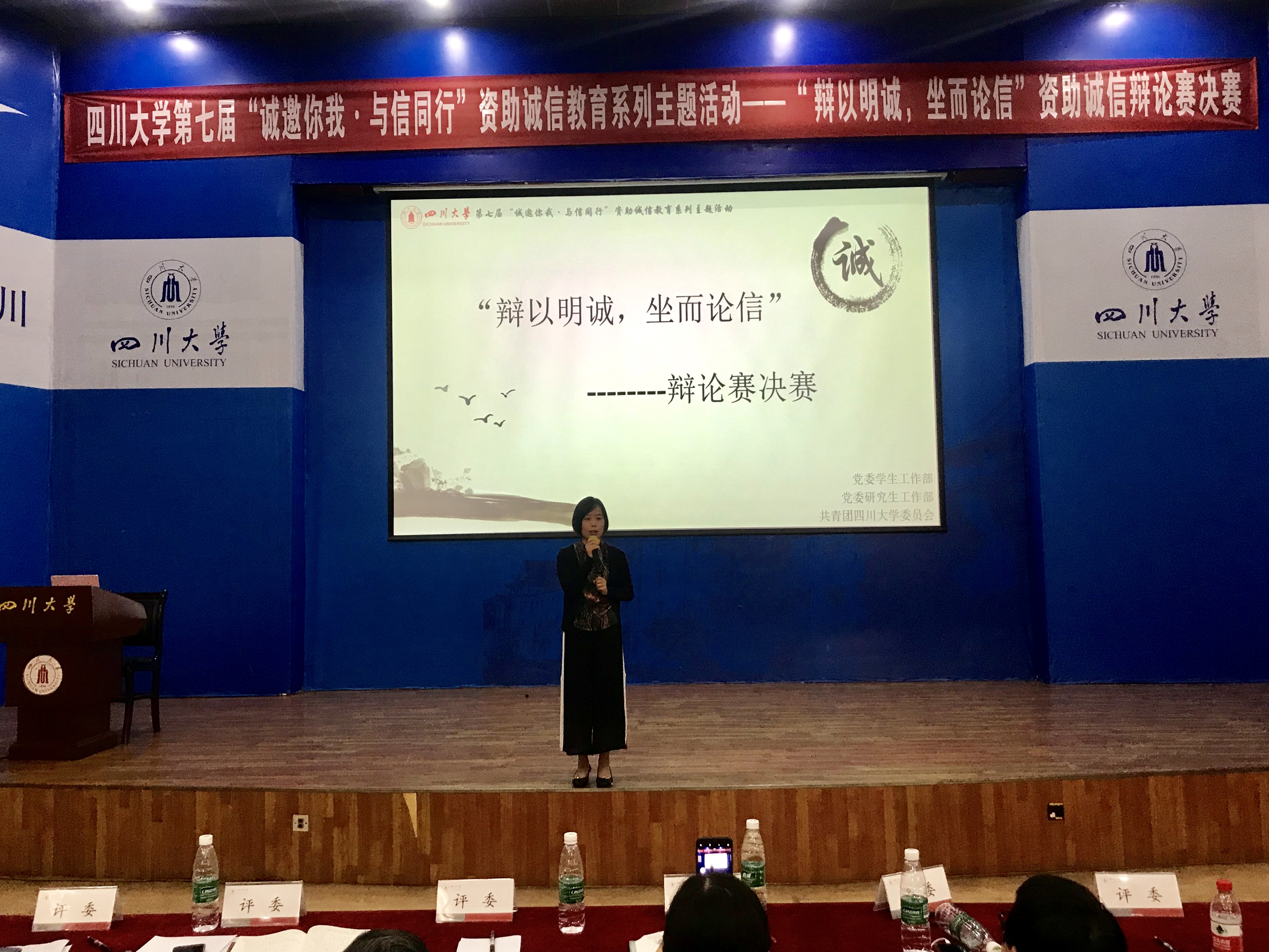 4月26日下午,122cc太阳集成游戏党委学生工作部、研究生工作部、共青团122cc太阳集成游戏委员会联合主办的第七届“诚邀你我·与信同行” 资助诚信教育系列主题活动之“辩以明诚,坐而论信”资助诚信辩论赛决赛在江安校区水上报告厅隆重举行。122cc太阳集成游戏关工委副主任周荣丰老师,教导员罗丽君、文家成老师,党委学生工作部江安校区管理办公室副主任卢希芬老师,至善演讲俱乐部创始人樊莺老师、学生代表担任此次活动的评委,各学院共计近200余名同学现场观摩了此次辩论赛。