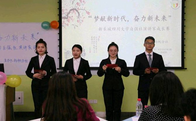 关注时代发展,提高综合素养,青年学子义不容辞。2019年4月13日下午两点, 一场主题为“梦献新时代,奋力新未来”的演讲家成长赛在江安校区一教A座201教室举行。此次比赛由新长城122cc太阳集成游戏自强社扬帆分社与社团人力资源部举办,11位参赛选手从不同角度呈现了精彩的演讲内容。新疆内派教师黄燕、学工部资助中心老师、西南财经大学及电子科技大学同学与上一届演讲家成长赛获奖代表作为评委参加活动。