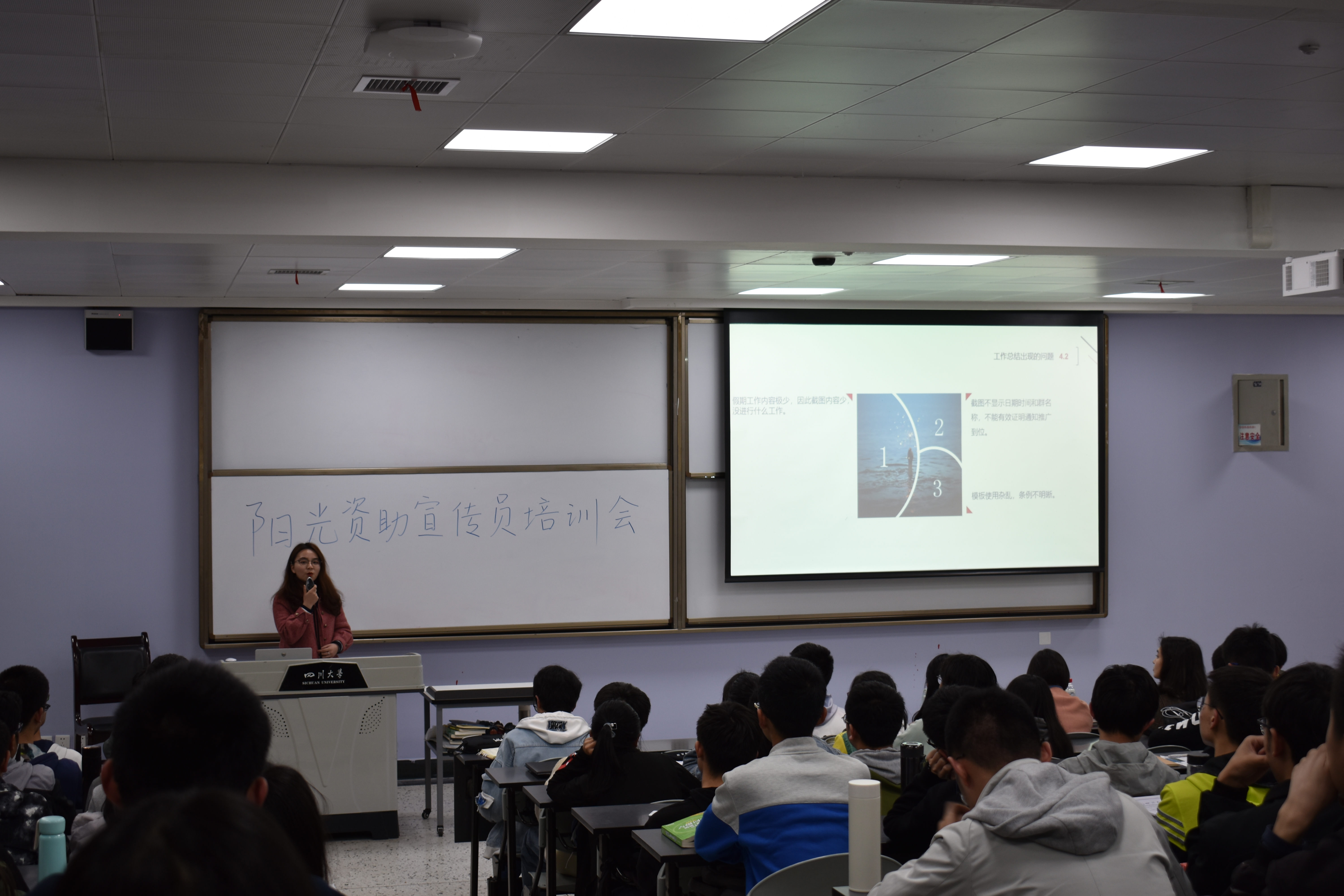 3月22日晚7点,春季学期阳光资助宣传员工作培训会在江安一教B205举行,学工部副部长卢希芬老师、资助中心迪丽达尔老师及全体在校阳光资助宣传员参加了本次培训会。