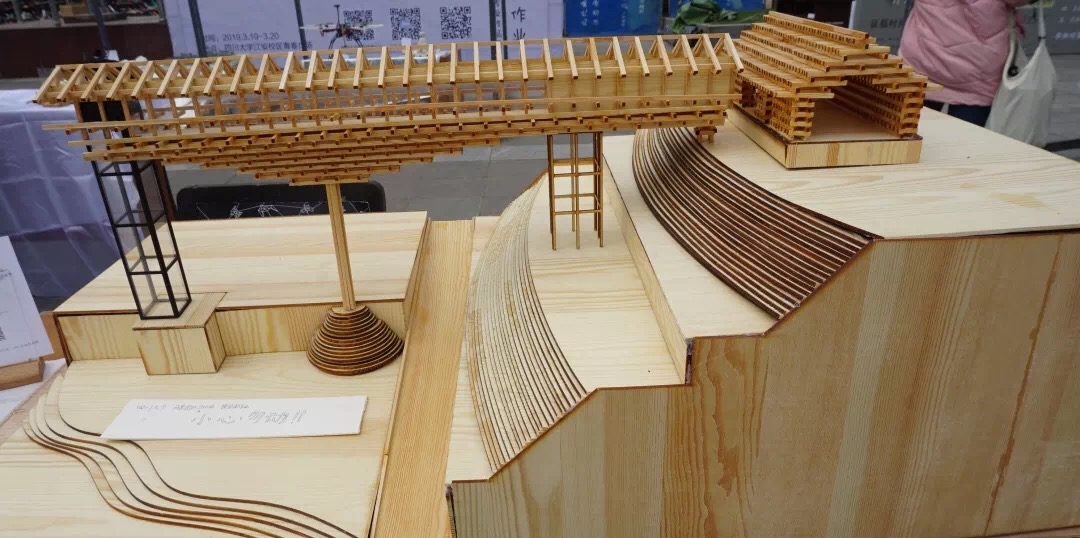 来自建筑与环境学院的梼原木桥博物馆成为整个展台最受关注的作品之一,精致的做工还原了经典原作;太古里模型,以川西风格的青瓦坡屋顶与格栅配以大面积的玻璃幕墙,用古典穿插现代的手法营造出一片开放自由的城市空间。