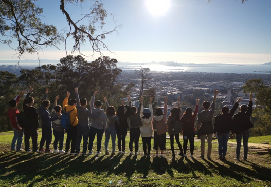 加州大学伯克利分校的后山在学生中可谓赫赫有名,从山上可以将旧金山湾区的美丽风光尽收眼底。1月25日下午下课后,在老师的带领下,同学们一同开启了伯克利后山的探索之旅。伴着明媚的阳光与点点微风,同学们一路欢歌笑语,来到了山顶。极目远眺,波光粼粼的海面、远处的金门大桥以及伯克利的标志性建筑“钟楼”可谓是尽收眼底。