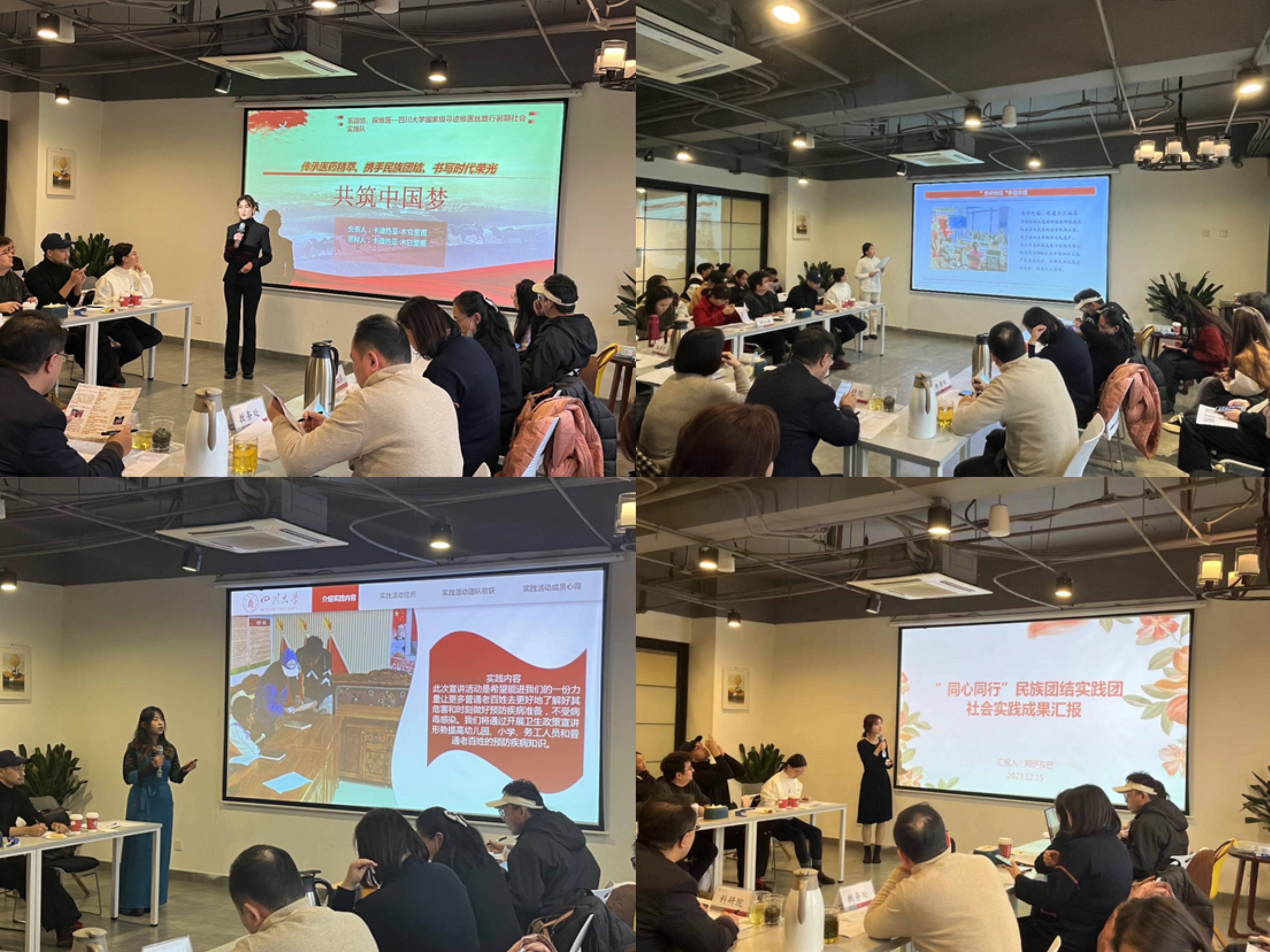 答辩展示会上,15支队伍依次上台,紧扣铸牢中华民族共同体意识主线,从选题背景、方案设计、实施过程、实践收获等进行了暑期社会实践汇报展示,分享了团队在实践中挖掘的民族团结典型案例、各族儿女在中华民族大家庭中守望相助的发展足迹、以及民族地区翻天覆地的变化等,充分彰显川大学子同心共圆中国梦的磅礴青春力量。