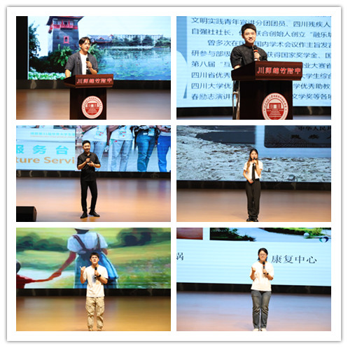 川师绵竹附中副校长肖永胜为活动进行开场致辞后,五位来自青春励志宣讲团的同学依次分享了他们的青春励志故事。文学与新闻学院2021级硕士研究生肖威搏讲述了他从战胜年少时的不幸遭遇到突破“残疾”的标签束缚,在奋斗与坚持中终于找到属于自己的光亮的故事;文学与新闻学院2022级硕士研究生杜宇翔以“万家风,中国梦”为题,讲述了为建造我国第一颗原子弹隐姓埋名罗布泊的爷爷,用踏实、厚实、老实、诚实的家风,让后辈胸怀祖国、勇担使命的故事;电子信息学院2021级本科生施金住分享自己在与 “绿色癌症”克罗恩病的抗争中最终蜕变为一名志愿者的心路历程;材料科学与工程学院2023级本科生周庆以“摇太阳”为题,讲述了在危急时刻因救助他人而致残的父亲在困境中为儿女“摇出太阳”的故事; 2023级预科生马筱虽然出生在无声的世界中,但她在与听障和解的过程中,创造出属于自己的精彩人生。每位演讲者都用自身经历生动诠释了青春与奋斗的意义。
